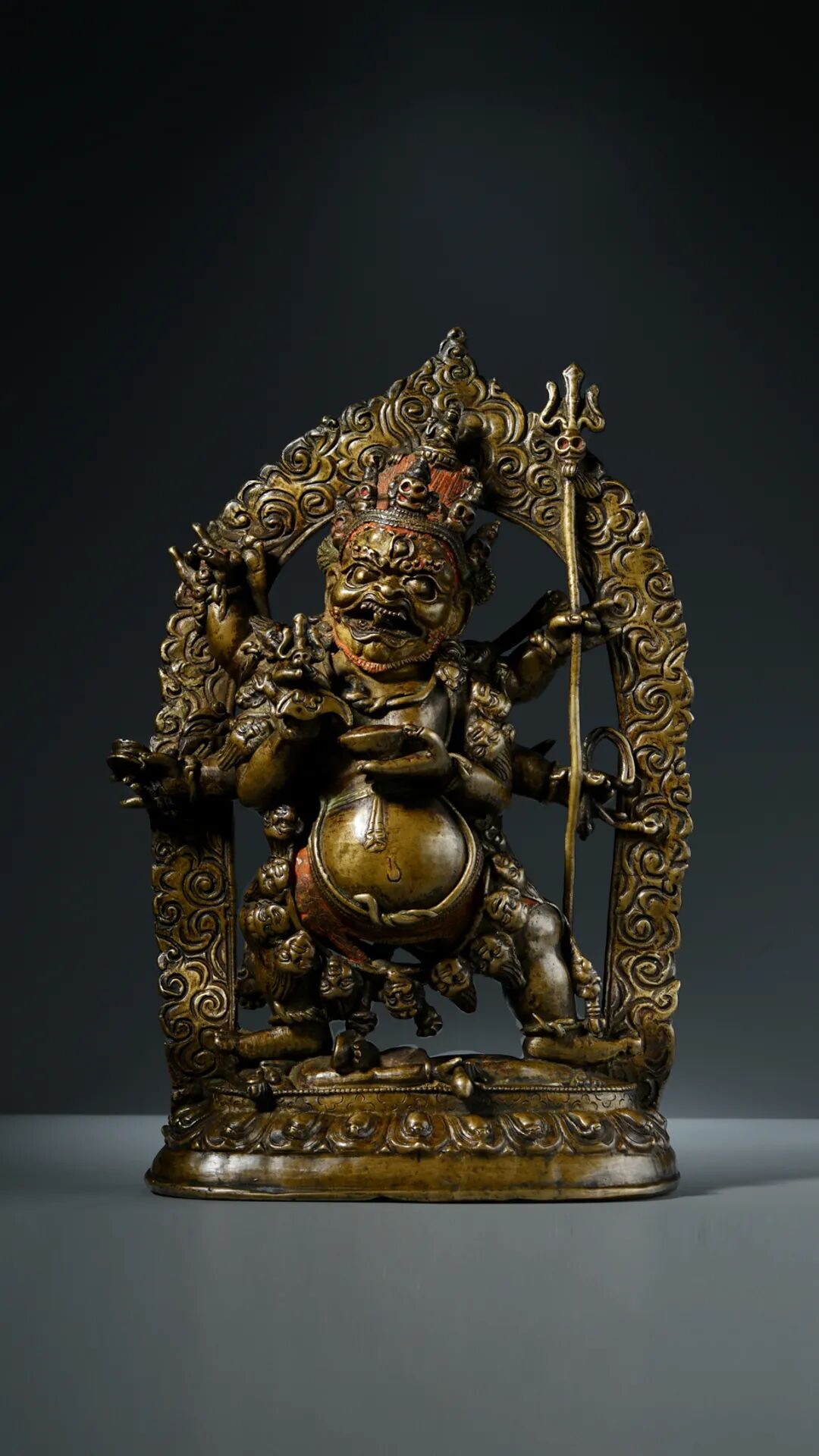 玛哈嘎拉是梵语大黑天的音译,又译为“救怙主”,原为印度教之魔神,相传观世音菩萨入其神识,使其皈依佛教,居诸大护法神之首,也是专治疾病之医神与财富之神,修持六臂玛哈嘎啦能庇护众生脱离中阴身,能解除众生生活的艰难困苦,圆满众生。此尊便是经典的六臂玛哈嘎拉形象,是16世纪左右西藏愤怒造像的典范之作。其戴五骷髅冠,红色的怒发如熊熊燃烧的火苗冲冠而上,发髻灵蛇盘绕,髻顶有化佛一躯。额头宽阔,面型方正,两颊凸起,须眉如火,威猛霸气;胸前挂人头蔓,雕刻精细,面目各不相同,在同类造像中非常罕见。胸前双手,右手执金刚钺刀,左手捧嘎巴啦碗;身后上方两手握象腿,撑开一张象皮披于身后,并持骷髅念珠和三叉戟;身后下方左右两手持手鼓和金刚索。此尊玛哈嘎拉有几点值得特别注意:一、常见的六臂玛哈嘎拉都是清代的,16世纪之前的该题材造像则非常罕见。二、六臂玛哈嘎啦是形象较为复杂的尊神,传世过程中手中的法器很难完整保存,而本尊造像不仅所有法器全部完整保存,而且有两处原装藏,极为难得。第三,此尊体量巨大,威风凛凛,有着超强的艺术价值,相信真正有眼力的藏家会请走这一尊。