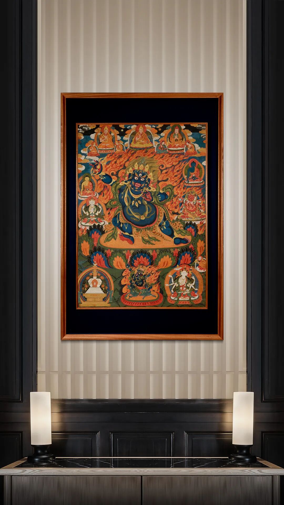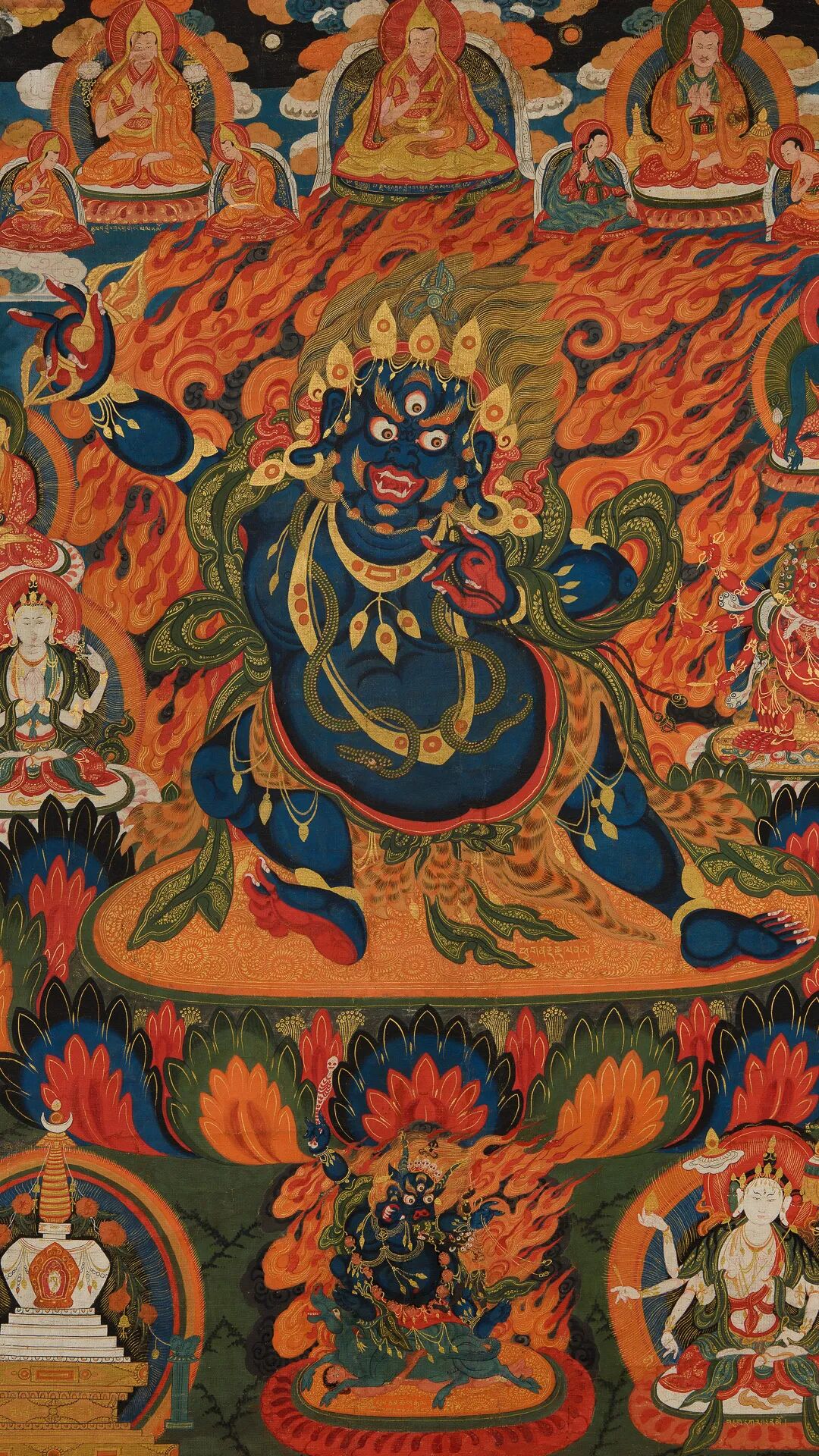主尊金刚手菩萨位于画面中央,肤色为深蓝,一面二臂,头戴描金五叶宝冠,金色的怒发如同火焰一般随风飘扬。圆鼓鼓的三目,恫吓人心;面部肌肉鼓胀,呲牙咧嘴,露出洁白的牙齿和锋利的獠牙,表情凶猛可畏,大有威震寰宇之势。在主尊上方的天界中为一位格鲁派上师,其头戴僧帽,左手捧宝瓶结禅定印,右手结说法印,全跏趺安坐于高等级僧床之上。上师座前的铭文大意为:顶礼杰尊喇嘛洛桑平措。其具体生平不详,但从其衣着和所在唐卡位置判断应是一位非常重要的格鲁派活佛。唐卡左上角为格鲁派师徒三尊,指的是上师宗喀巴·洛桑扎巴和他的上首弟子杰曹·达玛仁青、克珠·格勒白桑。他们三位是藏传佛教格鲁教派的代表人物。唐卡右上角为阿底峡大师和弟子及明妃。阿底峡尊者是中国西藏地区在朗达玛王灭法之后,复兴佛教的第一位重要人物,也是藏传佛教噶当派的奠基人。其右下角的上师根据铭文可知为阿底峡的三大弟子之一的俄·勒贝喜饶,他是噶当派重要寺院桑蒲寺的创始人。在主尊作有众多神佛,左侧为释迦牟尼佛和四臂观音,右侧为药师佛和马头明王。主尊身前左下角为一尊菩提塔,居中位置为阎魔尊,右侧尊胜佛母。在主尊莲台右下角还有一位跪着的白发僧人,他手持供养物,满眼的虔诚和坚毅,其应该为此唐卡的出资供养人,根据铭文可知他名叫洛桑雅培。此幅唐卡画面构图严谨,仪轨如法,图像清晰生动,恢宏大气,具有极高的艺术水准,和重要图像学价值。且如此大尺寸的唐卡存世量极为稀少,当初必定供奉在重要格鲁派寺院,等级甚高,是极为罕见的收藏佳作,值得大家特别关注。