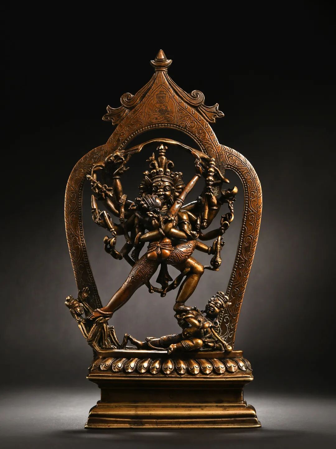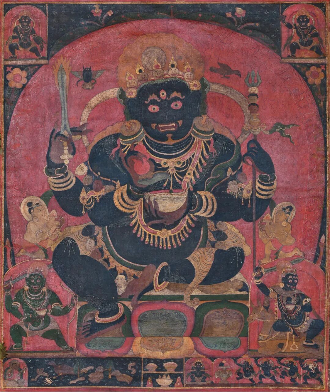 拍品估价:1,200,000 - 1,800,000人民币这是一幅带有浓厚尼泊尔绘画风格影响,绘制于藏地的精美四臂大黑天唐卡作品。本幅画作近方形,四臂大黑天身形饱满健硕,四肢粗壮,占据整幅作品的大部分比例,在构图上极具视觉冲击力。大黑天面庞方中带圆,五官的描绘极具装饰感,眉毛呈红色的宽波浪状,似跳动的火焰,托大黑天忿怒的神态,红色的三只眼睛圆睁,张口露牙。面部呈蓝黑色,五官线条均以白色细线勾勒轮廓。大黑天左手持盛满鲜血的噶布拉碗,右手持钺刀,其余两臂屈肘置于身体两侧,右手持带有火焰的宝剑,左手持三叉戟,半跏趺坐于莲座的尸体上。大黑天身着华丽的装饰物,手腕和胸腹前盘绕翠绿的蛇。胸前红色的项圈上垂下整齐的流苏状装饰,延续着波罗王朝以来的样式,人头穿成的宝鬘从大黑天肩后垂挂至腹前,腰间系虎皮,是忿怒尊神常见的饰物和装束。尊像下方的莲台华丽多彩,花瓣以红、绿、黄色为主,晕染过渡自然,如同日月光晕一般,既有强烈的装饰性,又具独特的立体效果。宽大扁平的双色莲瓣内层瓣尖上卷,形成小水花一般的生动造型。主尊背后的红色背光中,绘制了黑色的鸟,是大黑天周边经常出现的动物之一。画面上方左右两角各有一位蓝色身的护法,莲台上左右两边各有一位袒上身的供养者,表情虔敬,双手捧持宝瓶单膝跪地。莲座左右为绿色的四臂忿怒尊和骑骡的吉祥天母。画面底端为一条狭长的区域,左侧有一位着僧袍的上师,右手举于胸前,左手握白色持物,中段绘制了奔跑的猛禽与人物残躯;最右侧绘制了两臂的宝帐怙主、宝瓶与四位鸟面和兽面的护法。