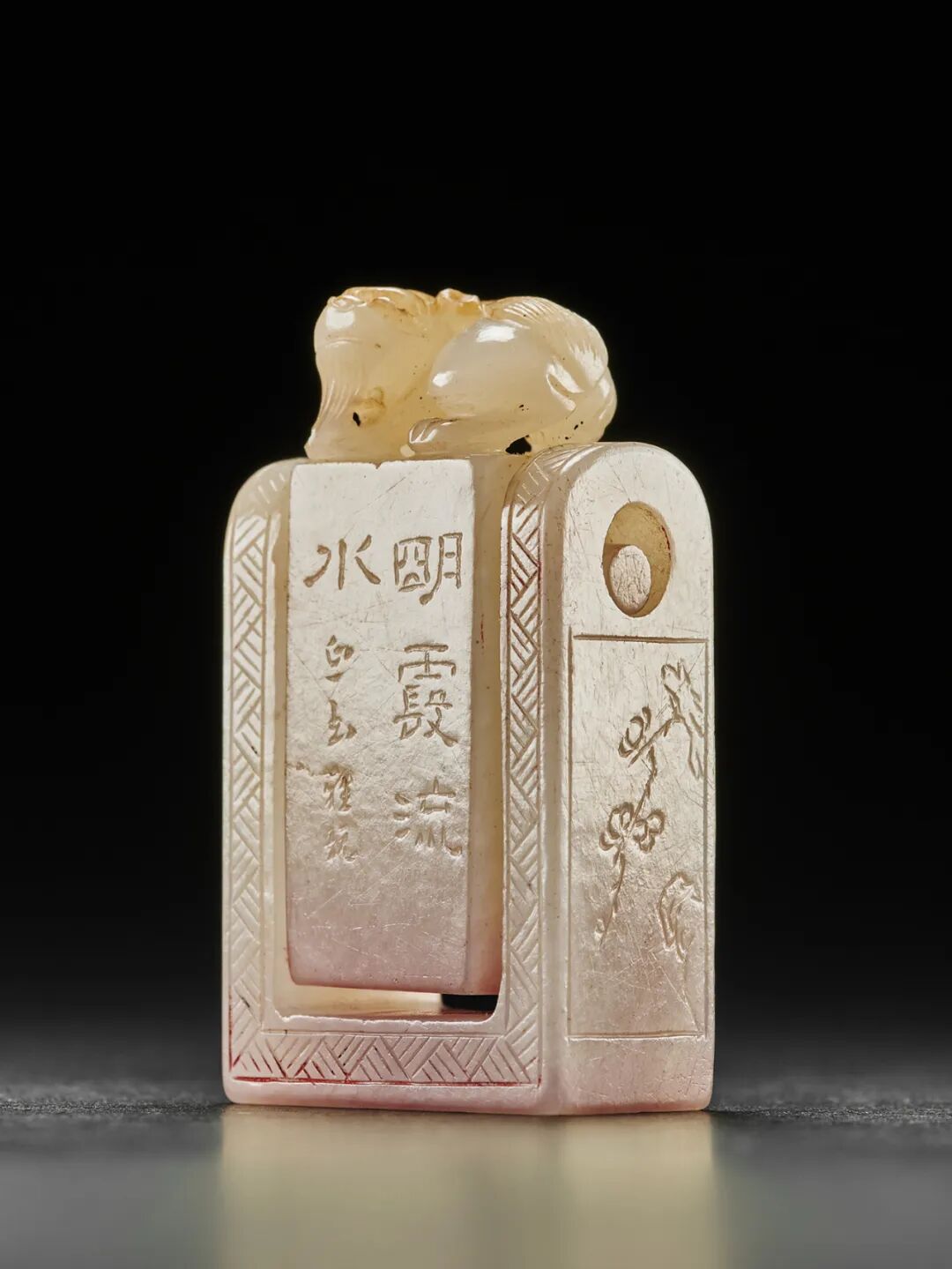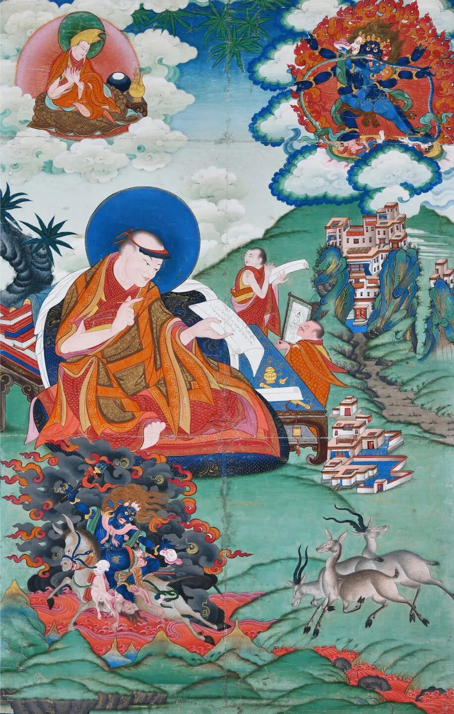 拍品估价:800,000 - 1,200,000人民币 本幅唐卡的主尊为阿旺曲吉旺修,他是藏传佛教格鲁派达擦济咙活佛转世系统的第五世。历世达擦济咙活佛唐卡是一个系列,目前大部分画作保存于纽约鲁宾(Rubin)博物馆,而本幅唐卡是该系列画作中艺术成就最高的一幅。唐卡背面有两个手印,并都有金字题记和盖章。上部的手印为淡黄色,题记为“贡萨嘉旺强白嘉措无误手迹。下部的手印为鲜红色,题记为“达擦诺门罕萨玛德巴杰无误手迹”。即上部的手印和盖章来自八世达赖强白嘉措(1758-1804),下部的手印和盖章来自八世达擦济咙活佛洛桑益西丹贝贡布(1760-1810)。八世达赖喇嘛强白嘉措当时是西藏地方政府名义上的最高统治者,八世达擦济咙活佛洛桑益西丹贝贡布是当时西藏地方政府的“摄政”。两位政治领袖同时在一幅唐卡上加盖自己的手印并盖章,类似情形极为罕见。这幅唐卡不仅是一幅具有浓厚汉风古韵的优秀佛教画作,它更是历史的见证者。为了维护祖国统一和民族团结做出突出贡献的杰出人物,如乾隆皇帝、八世达赖喇嘛、八世达擦济咙活佛、乃至嘉勇公福康安、超勇公海兰察等等都或明或暗的呈现其中。通过深入研究这幅唐,可以对乾隆皇帝“十全武功”收官之作的廓尔喀战争会有更丰富的认识,对《钦定善后章程》的成型有更直观的理解,达擦济咙活佛在这一系列中华民族共同体形成过程中的历史贡献有更清晰的认知。