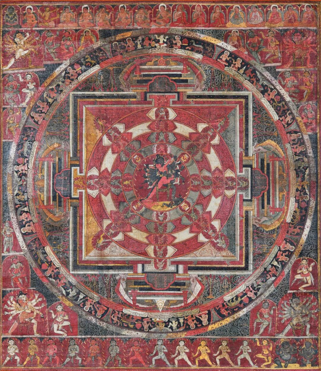 拍品估价:1,500,000 - 2,500,000人民币本拍品表现的是胜乐金刚六十二尊坛城及修法传承的内容。唐卡主体为外圆内方的结构形式,其中方形坛城由五重同心圆构成,由内而外依次是大乐轮、意密轮、口密轮、身密轮和三昧耶轮(又称观想轮),各轮皆有不同的神灵安住,五轮加上四门的尊神总计为六十二尊尊。方城的四门皆有门楼和城墙围绕,门楼巍峨高耸,装饰华丽,四边城墙由屋檐、水沟、护城河和城垣构成。方城之外是圆形的护法墙,由内向外依次为莲花墙、八大寒林墙、金刚墙和火焰墙。坛城之外的四隅及上下各绘有不同的尊像,主要为传承胜乐金刚六十二尊坛城修法的印度及西藏祖师。唐卡下方为舞立的尊神,表现勇士和空行两种不同的类型,与胜乐金刚修法密切相关,因为胜乐金刚修法中常伴有无数的空行,故胜乐又有“亿万空行总主”之称。此幅唐卡内容丰富,表现了胜乐金刚坛城的完整图像和传承修法的历代印度及西藏上师。画面构图严谨,勾勒精细,色彩丰富和谐,品相完好无损,是一幅十分难得的西藏早期唐卡珍品,具有重要的艺术和宗教价值。