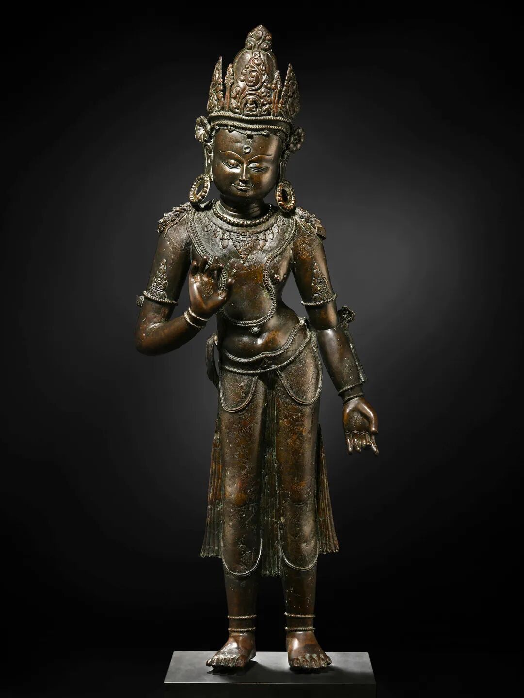 拍品估价:1,600,000 - 2,600,000人民币 这件莲花手菩萨像显示了多种风格相混合的样貌,是典型的西藏风格未成熟之前的造像特征。此像体型较大,从侧面观赏身形宽厚,体量感极强。造像以朴实的手法表现了华丽的衣装,工艺有稚拙之感,与西藏早期像有诸多类似之处。从造像样式来说,出现了多种风格的杂糅,反映了这一时期,西藏学习外来风格,逐渐形成自身特点的过程。因此,这尊菩萨像为典型的西藏早期造像,从工艺、图像和风格上均能体现出鲜明的时代特征,尤为难得。