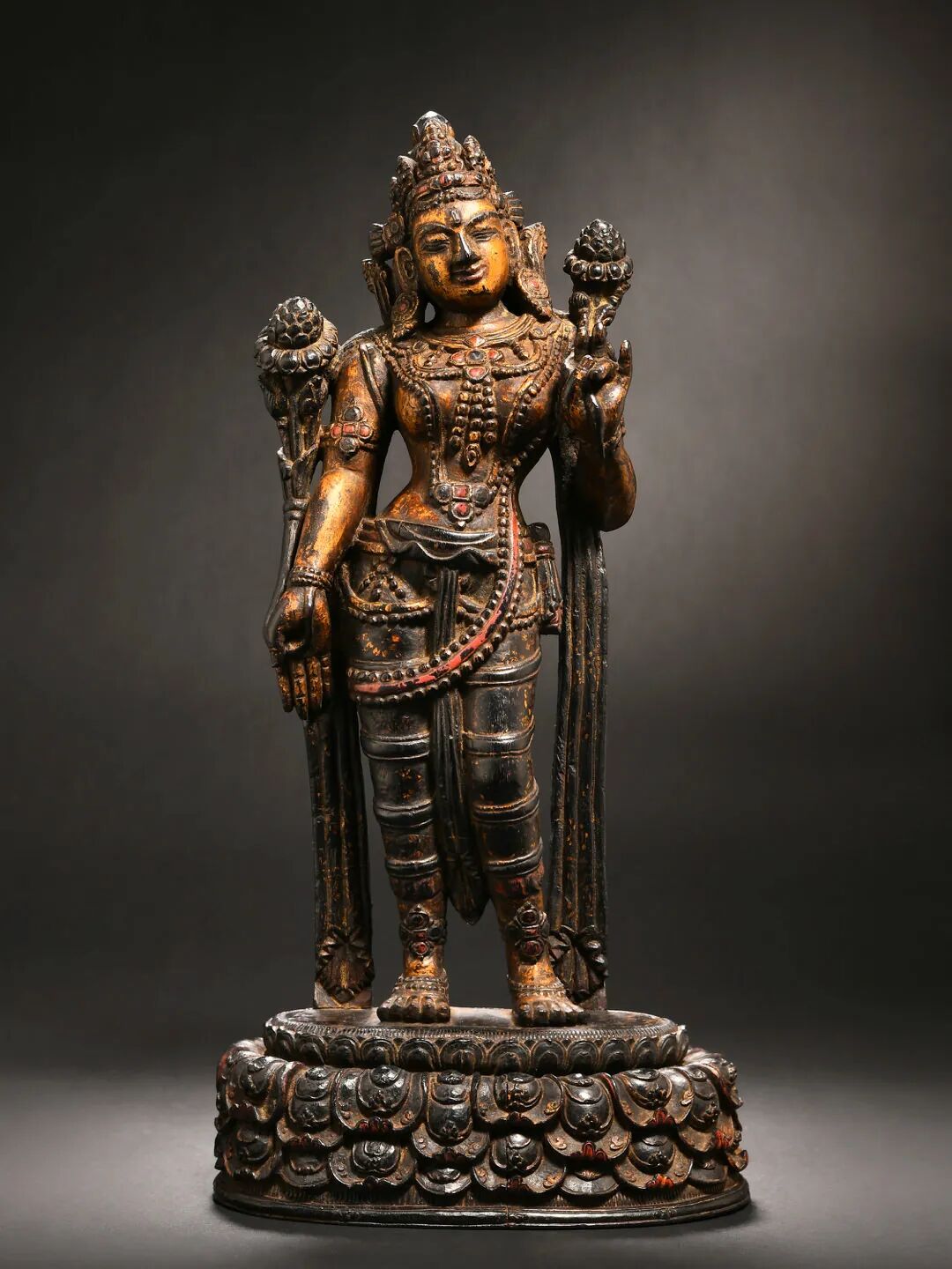 拍品估价:900,000 - 1,500,000人民币 这尊毗湿奴造像为典型的克什米尔风格,尊神面部呈饱满的椭圆形,五官分布较满,弯眉高鼻,嘴唇圆润,杏仁状的大眼睛嵌银,直视前方,中央凹陷的圆孔示意瞳孔。毗湿奴像四臂,上面两手持海螺和莲花,下面两手于体侧抚摸两侧小像头部。这两尊小像为毗湿奴武器的人形化现,头与上身斜向主尊外侧,与毗湿奴直立的姿态形成对比,是毗湿奴像常见的表现形式。由于克什米尔地区历史上战火纷飞,王朝更迭,大部分作品或被毁坏,或被重新熔铸,因此保存至今的作品尤显珍贵,而这件印度教毗湿奴造像,无论其宗教或派别所属,其精美的做工、细腻莹润的铜质,饱满精巧的造型,对于我们认识同时期克什米尔造像艺术都是一件难得的佳作。