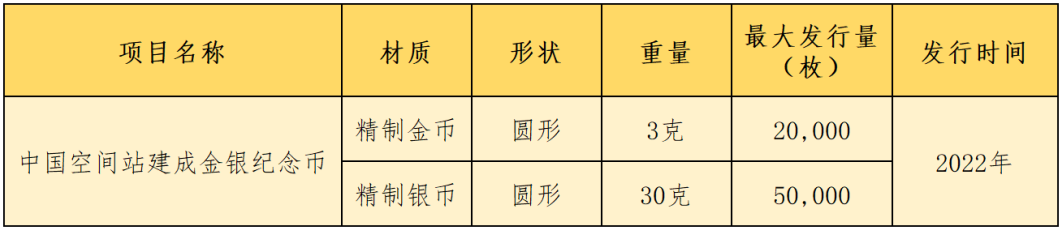 根据中国人民银行的发行计划,今年计划发行一组“中国空间站建成金银纪念币”,包含1枚3g金币和1枚30g银币。