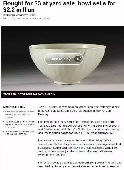收藏圈流传着这样一个故事:10年前,美国纽约有一家人在旧货甩卖中花了3美元淘到一只乳白色的旧瓷碗,买完之后就放在家里的壁炉上当做装饰品,直到有一天一位专家去家里做客,看到这个碗之后直接就震惊了。