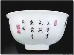 侧面海有乾隆御笔行楷题诗:“玉剪穿花过,霓裳带月归”,碗底有蓝楷书款《乾隆年制》。在2006年11月28日香港佳士得“中国瓷器及工艺品”秋季拍卖会上,被香港女富豪、收藏家张永珍以1.5123亿港元(约为1.3亿元人民币)拍得。