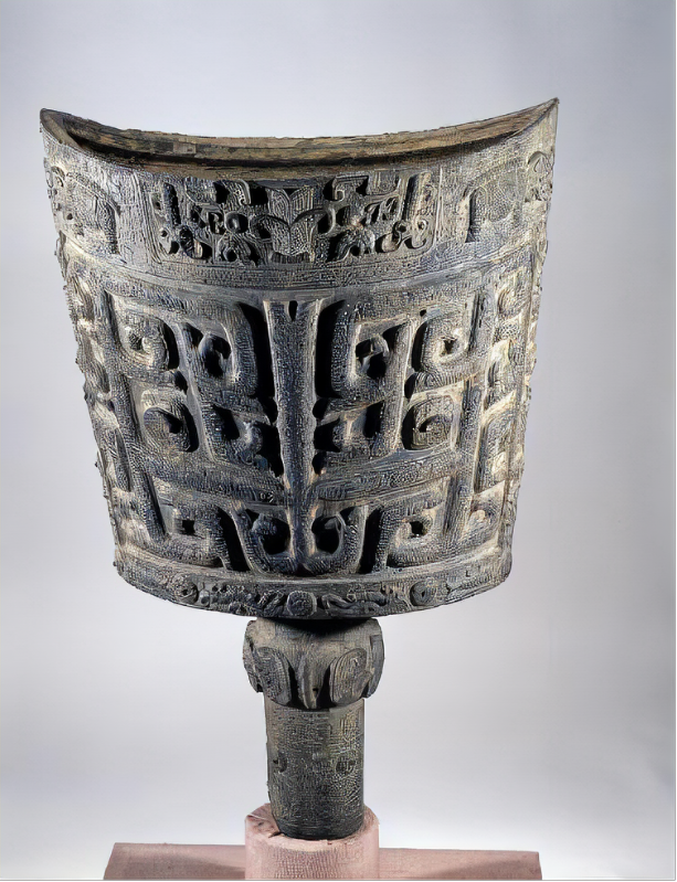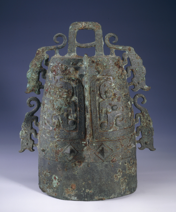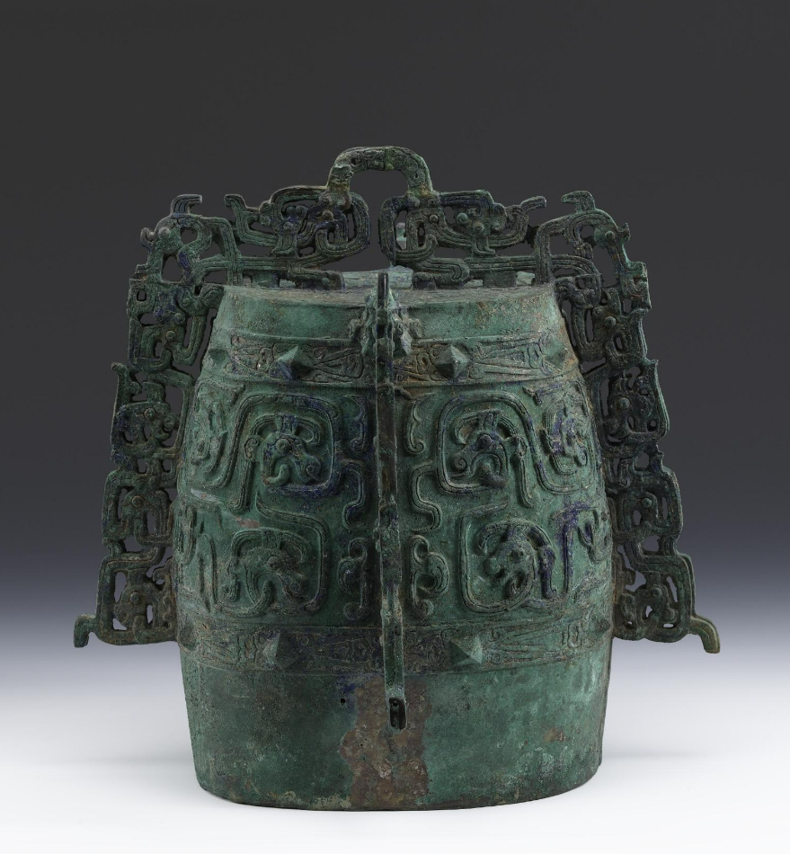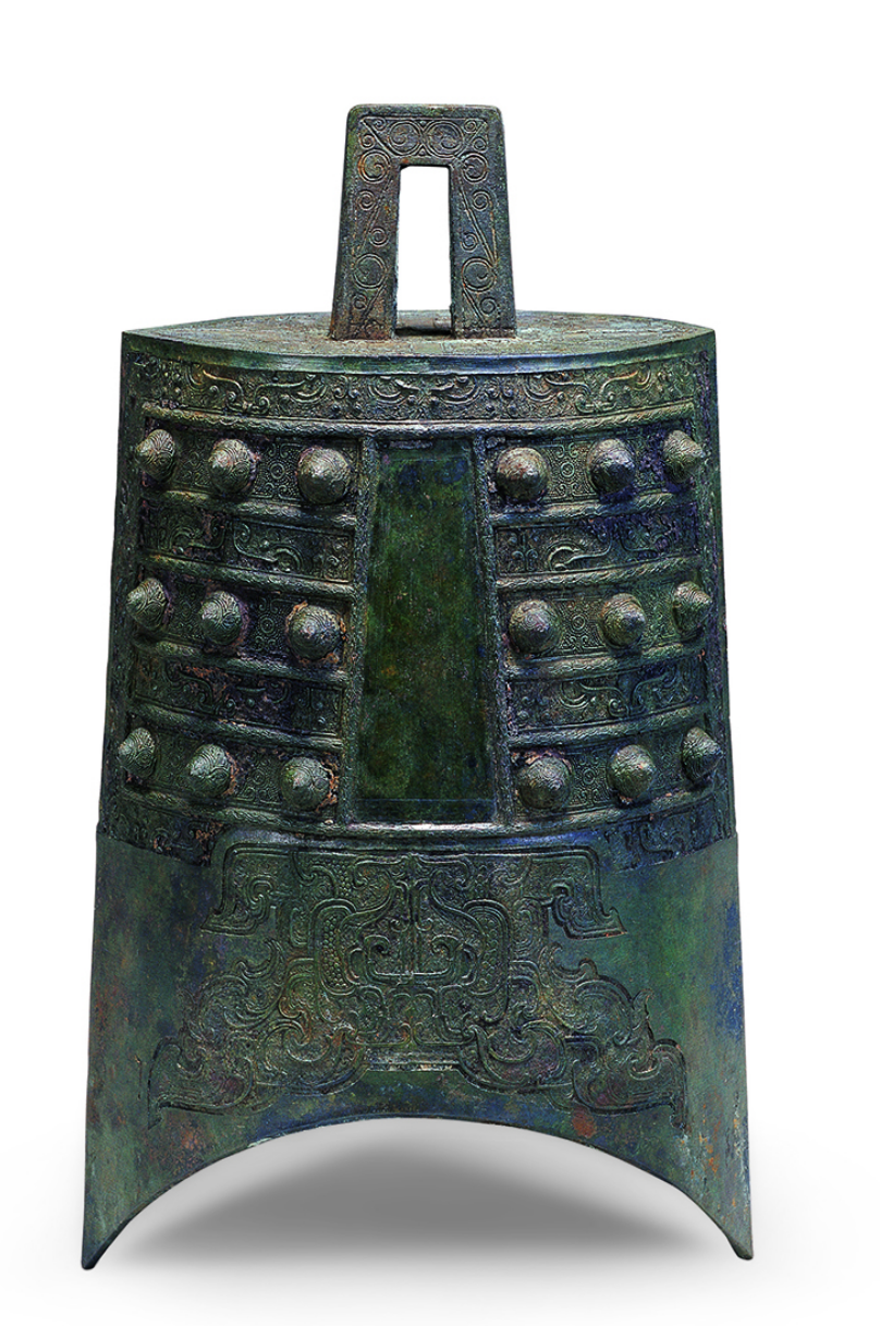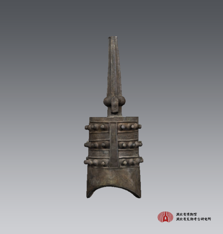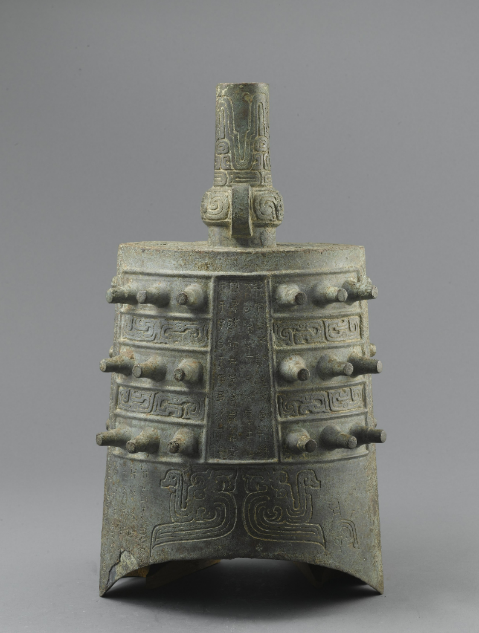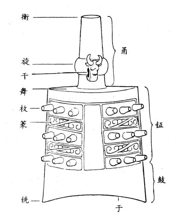 共鸣箱的平顶称为“舞”,正背的中上部直的阔条称为“钲”,其两边突出的乳钉称为“枚”。