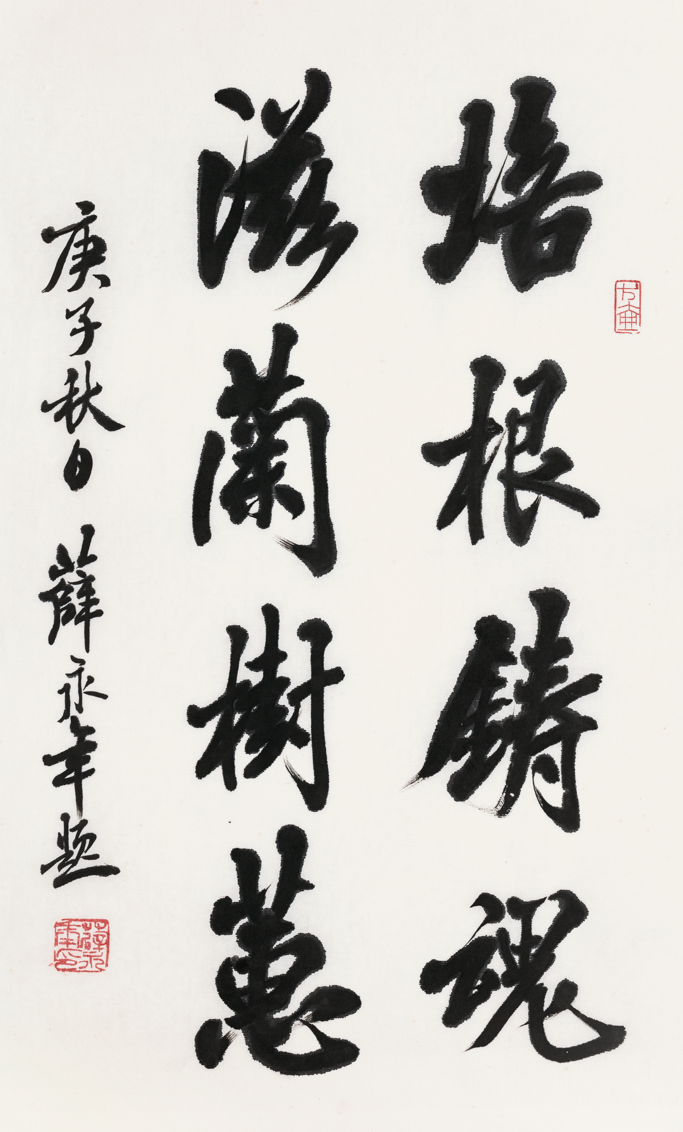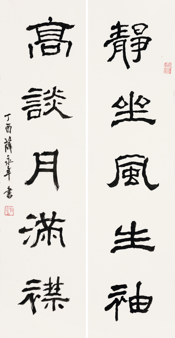 此次书法展展出薛永年先生近年书法作品40余件,以行楷为主,包括四条屏、中堂、斗方、条幅、对联、扇面等形式,书写内容有本人所作题画、纪游、感事的近体诗和所书古诗词。薛永年先生书法 培根铸魂 滋兰树慧69×40cm 2020 年薛永年先生书法静坐高谈五言联68×17cm ×2 2017 年薛永年书法集首发式和书法展的顺利举办,让我们认识了薛先生作为一个书画理论家的另一面。薛永年作为蜚声中外的美术史家、美术评论家和书画鉴定家,这使得人们常常忽视他在书法篆刻方面的成就。这个展览让我们看到他丰富多彩的书法作品,为我们了解薛先生的精神世界提供了一个新的视角!地址:北京市朝阳区亚运村慧忠路9号