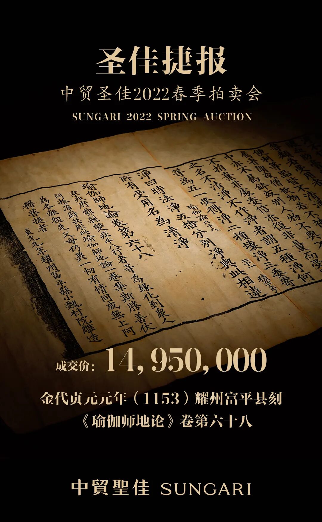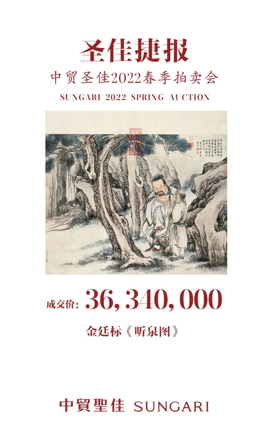 7月23日,中贸圣佳2022年春季拍卖会于圣佳艺术空间隆重举槌,书画板块率先开拍,琳琅—重要中国书画及古籍夜场领衔,携中国近现代书画专场、欣赏历代奇 - 中国历代法书墨迹专场、中国古代书画专场,在开拍首日突破两亿成交额!四大专场亮点频现,开端喜人,线上线下竞价热烈,精彩纷呈。其中备受关注的乾隆帝御题的金廷标《听泉图》最终以3634万元成交,领跑书画夜场。