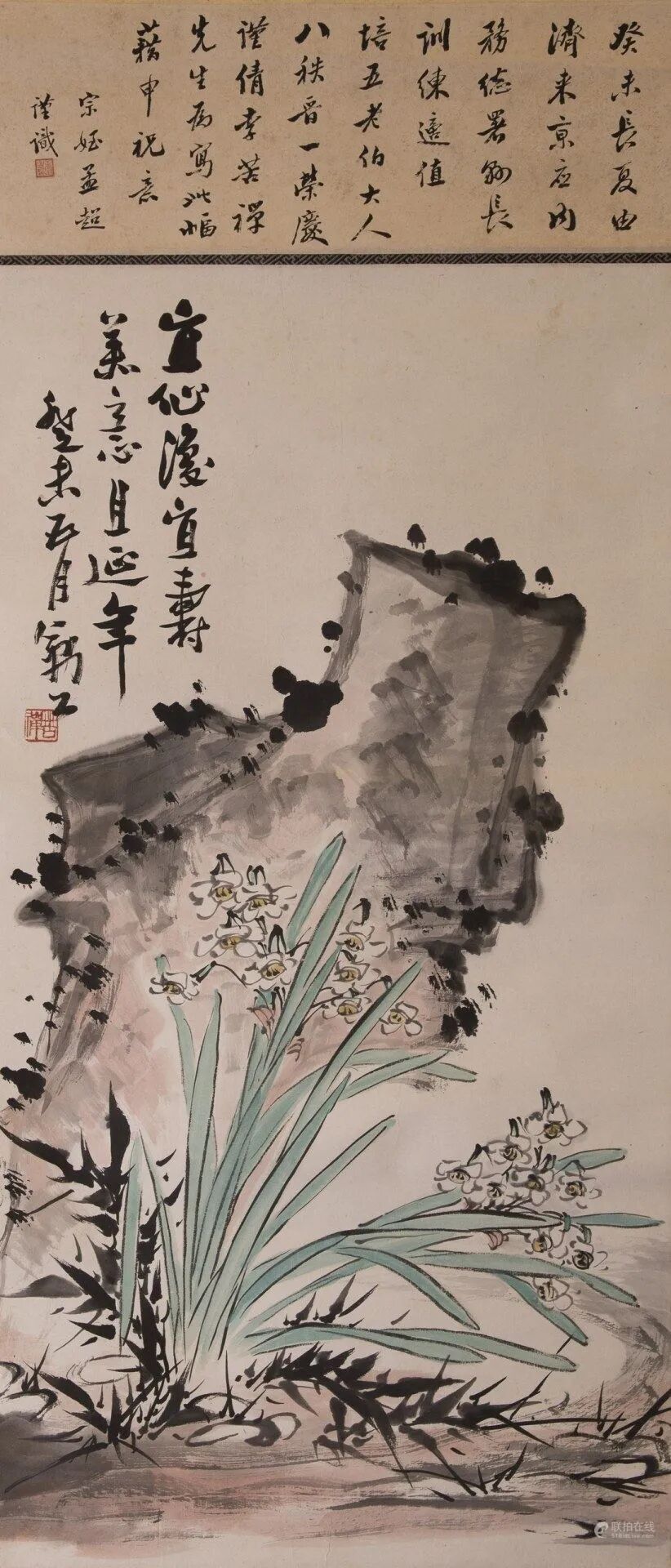 Lot 5304 韩维(1017-1098)款 山水Lot 5331 李苦禅 (1899-1983) 水仙洞石图Lot 5334 于右任 (1879-1964) 书法对联尺寸:H 11 x 53cm