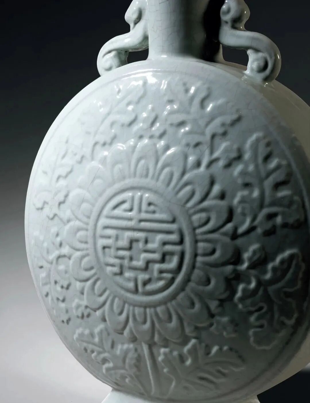 清雍正 仿官釉模印“菊花团寿”纹双耳抱月瓶