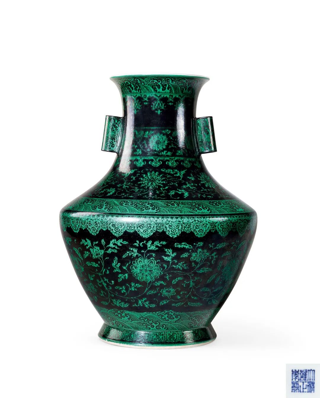 清雍正 墨地绿彩缠枝莲纹折肩贯耳尊