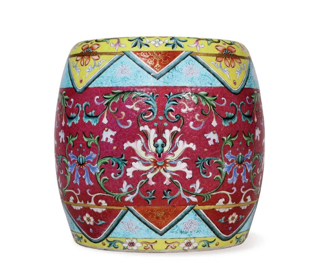 清乾隆 胭脂红地洋彩轧道缠枝花卉纹鼓墩式迎手