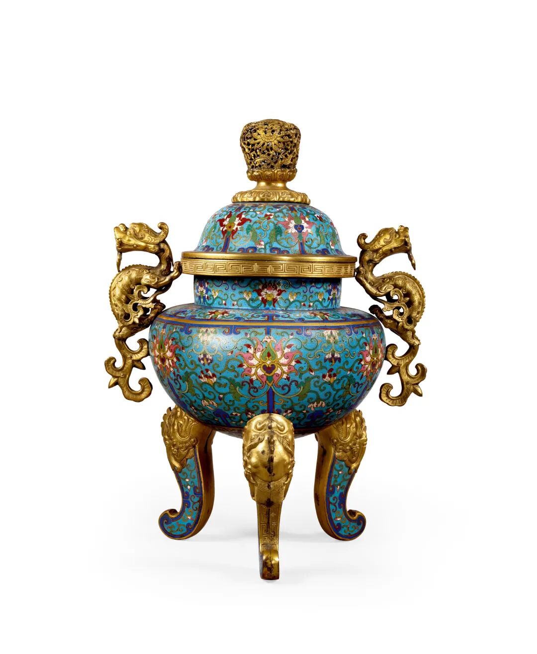 清乾隆 铜胎掐丝珐琅缠枝花卉纹双龙耳三足盖炉