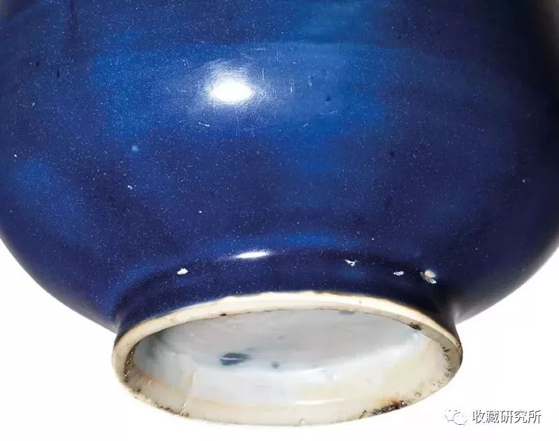 32、底釉变色:不被人们理解,但却是一条重要的古瓷鉴定依据。瓷为无机物,会变色,解释不通,但存在。青花瓷底釉,一般是白色向鸭蛋青色过渡。鸭蛋青色,封闭一年,色转白;开封三天,色转绿。出现底釉变色现象的,其釉里都会找到一些﹑成蓝色点状的矿物料,无仿者。![]()