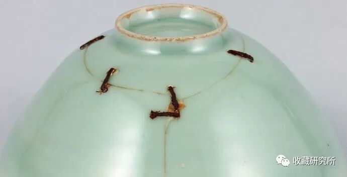92、清锔:清锔又明显比明锔苗条,长约一厘米,锔身的棱角消了,边缘已显圆滑,锔的厚度也轻薄多了。并以机器冲压为主。还常见到。没有听说有仿锔的。清锔不见棱边,锔身两头尖,中间宽。细瓷常用铜锔。![]()