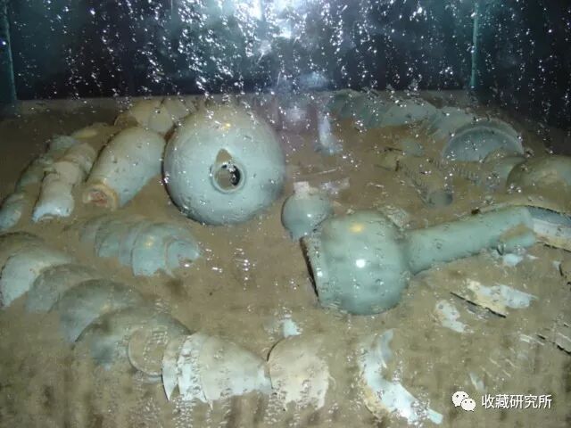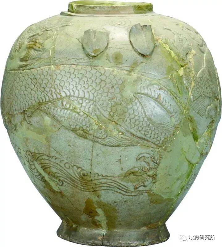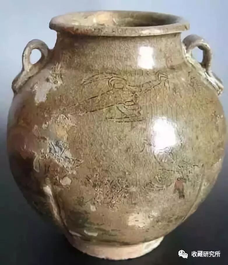 五代越窑青瓷浮雕贴金蟠龙纹罂,底径14.3、残高37.2厘米,1965年杭州玉皇山钱元瓘墓出土,浙江省博物馆藏54、干坑:是指没有被水浸的,一般是地理位置高的,其所出之物曰“干坑货”,又曰“北边货”,其特征又是一番话。干坑瓷的破泡里, 钻入的是黄水斑. 而烂坑瓷的破泡里, 钻入的是臭干黑。![]()