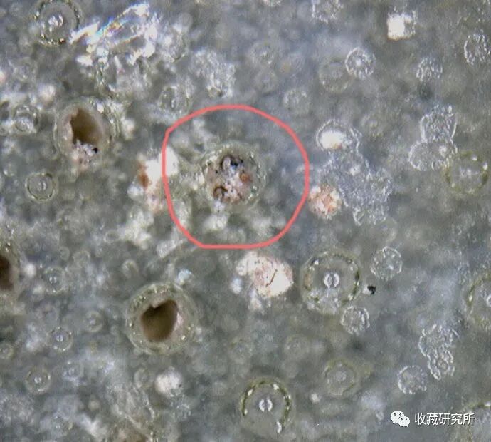 7、臭干黑:是指腐败的有机物沁染了古瓷,多数表现在素胎﹑破泡处。经长期水泡,会发软,涨大,而被洗掉。作伪仿者,用河塘污泥。在放大镜下有区别:臭干黑,无定形,河塘泥,有土粒。特别是微破泡里钻进的臭干黑,是需上百年才能形成,一般是出现在明之前的古瓷上。清三代的瓷上也会有,但很少,用放大镜寻找,也较难。晚清的,只有在欠火的低温瓷上,才能找到一点点。![]()