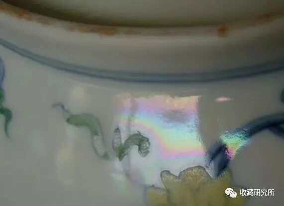 8、黄金斑:是指金器常年压挤古瓷,而渗透进釉泡﹑或毛粗糙处,而留下的黄金痕迹。仿不出。年代越久,渗透的越深,也不容易清洗掉。9、“先天蛤蜊光”是指古瓷长期受污染,而产生的五彩光,发金属亮光,直视无,侧目有。“后天蛤蜊光”是指经人们摩摸而产生的五彩光,其柔和,色淡,无金属光。针对蛤蜊光,再综合其它一些特征,可大致推判其出土时的基本环境。![]()