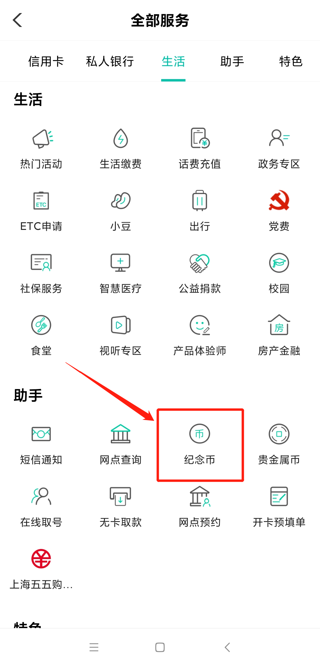 第三步:页面拉到最下方,在“网点”一栏,点击“纪念币预约”图标即可进入。