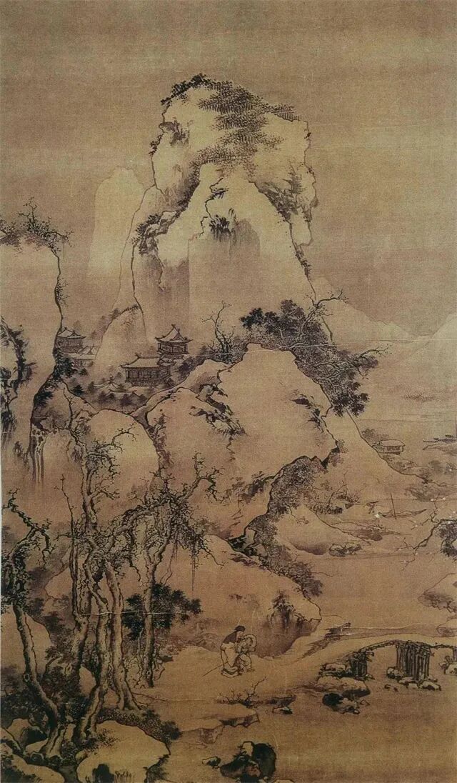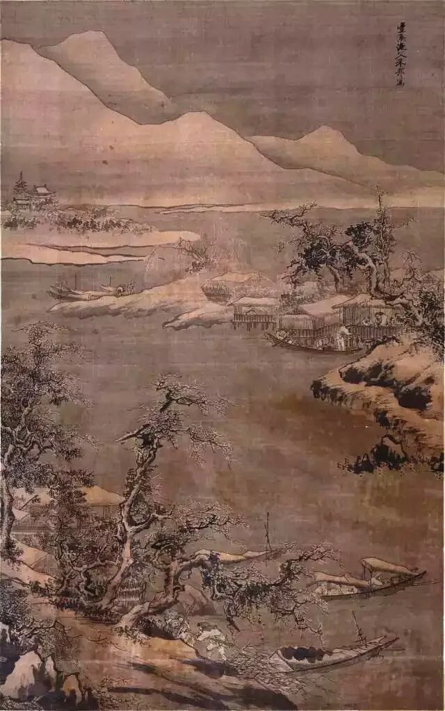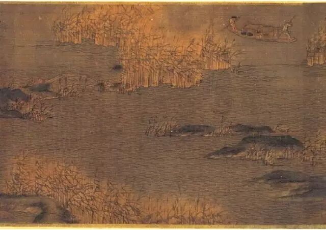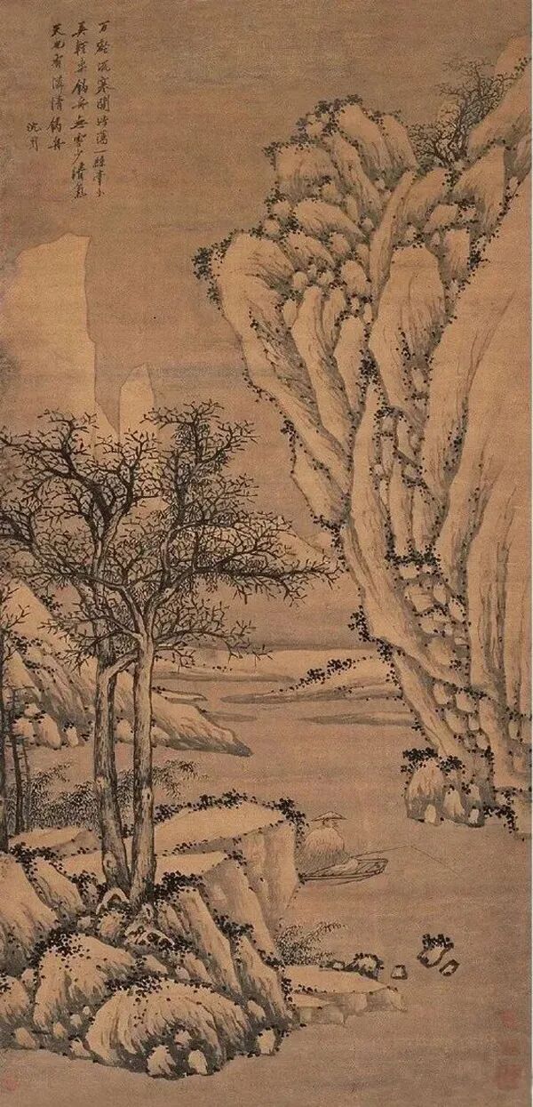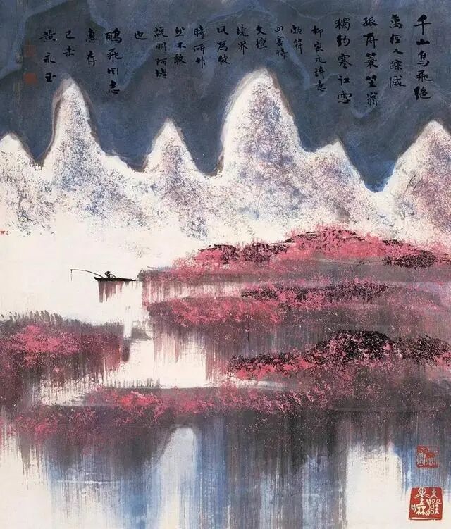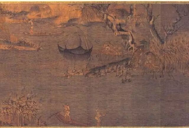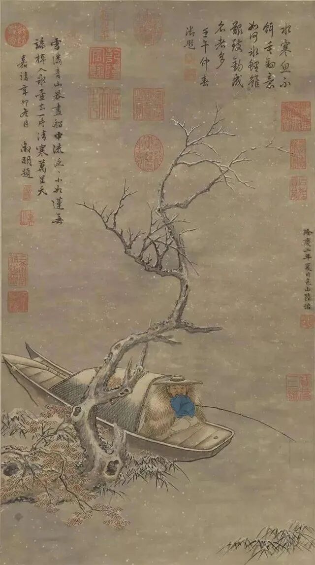 钓艇渔翁,片帆斜挂,独坐披蓑笠。
