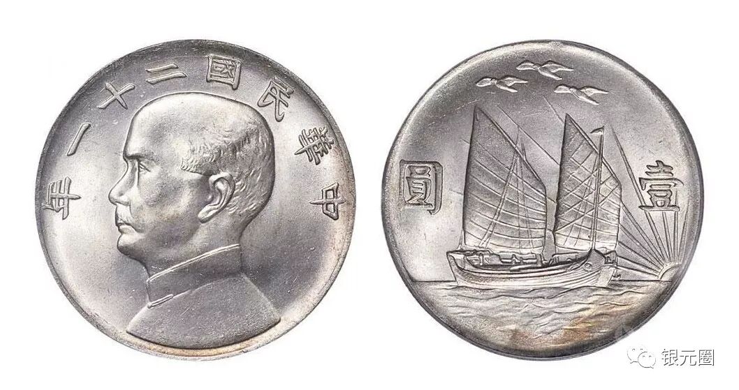 民国21年孙像帆船三鸟:通货品相50000元左右,美品一币一价。