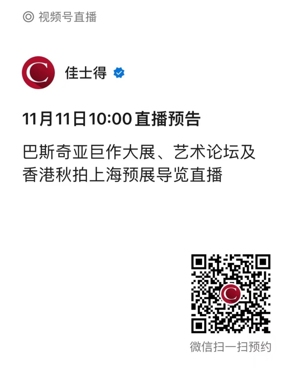 如您未能亲临现场,11月11日开幕当天,佳士得二十及二十一世纪艺术部国际总监谭波和资深专家张丹丹将在预展现场为大家进行现场直播导览。此外,佳士得还将与Artpro合作,邀请包括四方美术馆馆长陆寻、藏家郭玥、艺术家陈可,以及ArtPro联合创始人李琳及佳士得二十及二十一世纪艺术部亚洲现代艺术拍卖主管庄俊在内的重量级嘉宾,在现场举行一场名为《全球当代艺术品市场中的中国力量》的论坛,并将全程直播。请通过以下二维码,在佳士得微信视频号注册观看直播。
