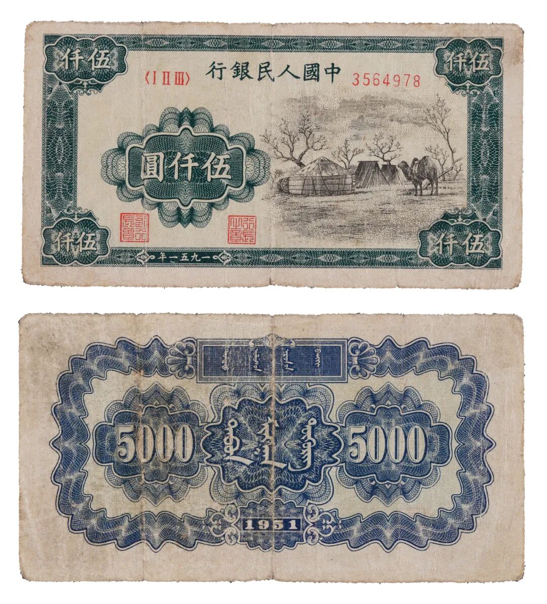 1951年第一版人民币伍仟圆蒙古包一枚,背蒙文,仅在内蒙古地区流通,因发行时间短暂,且印量稀少,存世无多,为一版币中前二稀缺品种,极为珍罕。此枚状态原始自然,墨色仍然鲜艳浓郁,带有岁月流通痕迹,未经任何人为修复,味道极佳,在此品种中颇为难得,值得珍重,PMG 15