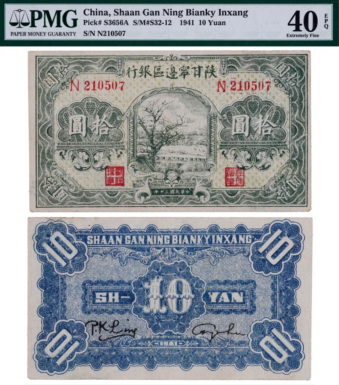 1941年陕甘宁边区银行拾圆山村树图一枚,纸张质感极佳,图案清晰,颜色鲜艳,获评PMG 40EPQ,为该公司该品种唯一EPQ评价,非常难得