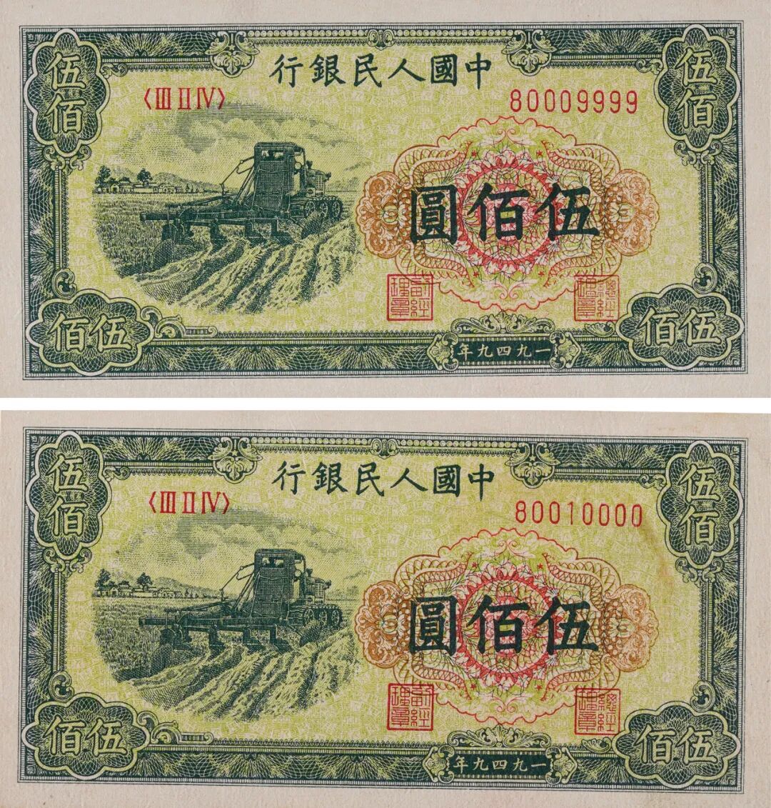 1949年第一版人民币伍佰圆收割机狮子号连号二枚,尾号9999及0000连号,号码中无4/7且均仅有三位数字组成,一版币因存世无多,狮子号以属难得可贵,而此组两枚均为狮子号且评级同分连号更是罕见,极具收藏价值,PMG 63