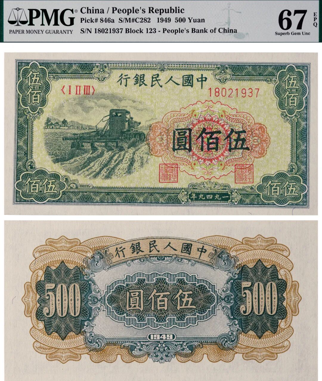 1949年第一版人民币伍佰圆收割机一枚,四边宽大,印製清晰有力,凹凸感强烈,纸张质感极佳,为一版币中顶级品相及评分,非常难得,PMG 67EPQ,为该公司第一名冠军分数