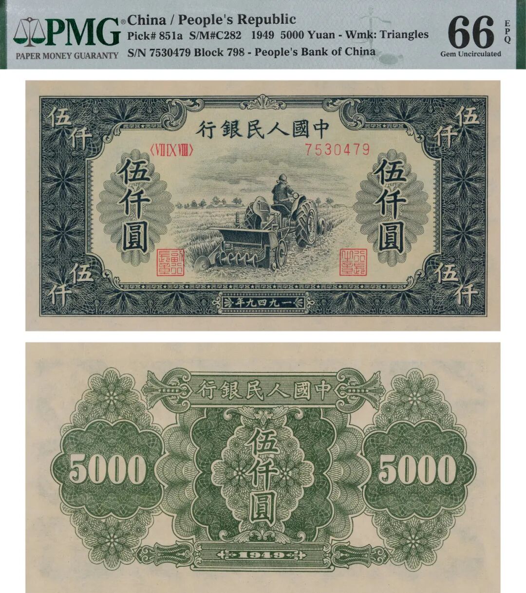 1949年第一版人民币伍仟圆耕地机一枚,为一版币中大面值高端品种,高品质极其少见,此枚票墨色醇正浓郁,纸张包浆原始自然,凹凸感强烈,质感极佳,市场上极难出现之高分品种,值得珍重,PMG 66EPQ,为该公司第一名冠军分数