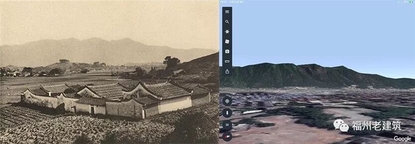 在截图中可以看到,弯曲着贯通左右的大路,左为桂香街,右为朝天桥。在桂香街尾与朝天桥相接处,路的北侧有一组由三座连续牌坊组成的牌坊群,脑海中浮现出了棠樾牌坊群的景象。能有这般高规格,或许便是上文提到的马森墓的一部分。更重要的是,可能它们便是常盘博士在去东禅寺路上所看到的“许多旌表牌坊”。如果常盘博士站在图中中山上红箭头起点处,沿箭头方向的视野也能确保右边确保有山坡入镜(图11)。为了再确定一下视角方位,突发奇想用谷歌地球的三维视角进行了模拟,远处的鼓山轮廓也能对得上(图12)。