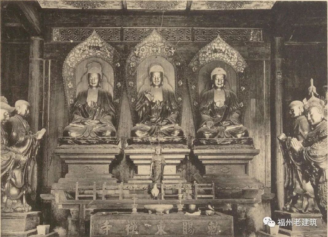 大殿内,以释迦佛、药师佛、弥陀佛三尊塑像为中心,前方左右安放迦叶、阿难两罗汉塑像,再前方为二天王塑像(图版第六十五(2))。左右两侧分列十八罗汉,中尊释迦佛前有一小佛,药师、弥陀两佛背后则为两尊观音。法堂内部,以观音为主尊,左右各有四尊天王。同时,东禅寺供奉的诸神包含了地方民间信仰,与一般有所不同。作者(常盘大定)特地留意与大藏经有关的资料,在寺内搜寻一番后,却只发现一块刻诗的木板。如今,这座寺庙归属西禅寺管理。虽然作者未能得到与大藏经有关的任何资料,但对寺中供奉着许多民间信仰的神祇引起了他的浓厚兴趣。引人思考的是,这所东禅寺看起来并不像是宋代雕印福州本大藏经的东禅等觉院。”