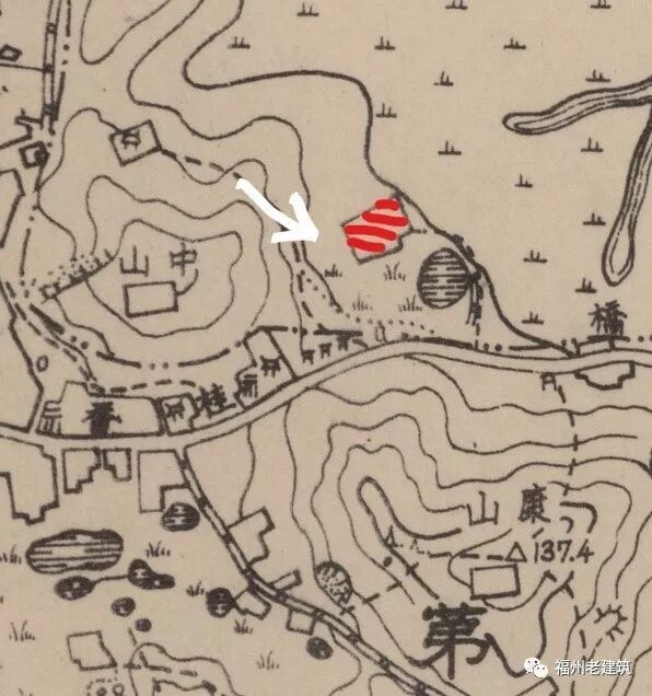 图9 推测的东禅寺位置(红框处)及图2拍摄视角(沿箭头方向)