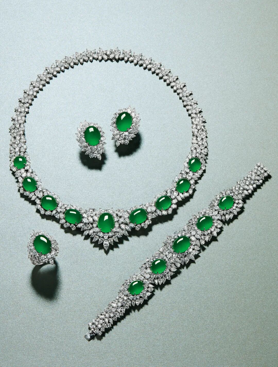天然满绿翡翠配钻石项链、手链、耳环、戒指套装
