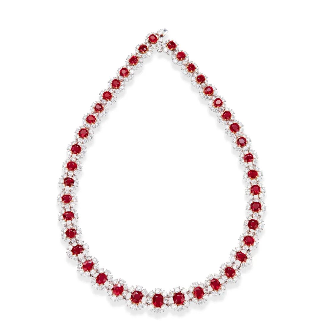 总重50.1克拉缅甸「鸽血红」红宝石配钻石项链,未经加热