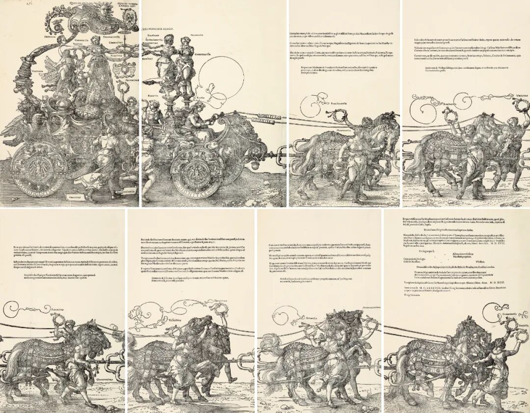 提要:本版画1589年威尼斯印刷。此作是为马克西米利安一世创作的三幅大型木版画之一,反映了马克西米利安一世作为神圣罗马帝国皇帝的至高地位。皇帝坐在高高举起的王冠下胜利,其羽毛状翅膀标有马克西米利安(Maximilian)军事行动的名字:“加利”(法国),“安加里斯”(匈牙利),“波希米亚”(波西米亚),“艾尔维蒂斯”(瑞士),“德国”(德国)和“威尼丝”(威尼斯)。其他六幅车牌各绘一匹马,带着豪华的马具,拉着马车前行。印刷品的许多部分都贴有标签以解释复杂的图像:轮子上有“Magnificentia”(壮丽)、“Dignitas”(尊严)、“Gloria”(荣耀)和“Honor”(荣誉);一个re绳被标记为“贵族“(Nobilitas)(贵族),另一个被标记为“Potentia”(权力)。马车的驾驶员是“比率”(原因)。每匹马都由一个举着花环的女性人物照看:从后到前,“Providentia”(证明)和“Moderatio”(中度),“Alacritas”(敏捷)和“Opportunitas”(机会),“Velocitas”(速度)和“Firmitudo”(坚挺),“Acrimonia”(敏锐/敏锐/活力)和“Virilitas”(活力),“Audacia”(听觉)和“Magnanimitas”(magananiminty)和“Experientia”(体验)和“Solertia”(技能)。马车上还有四个女性形象:“Gravitas”(重力),“Perserverantia”(恒心),“Fidentia”(保真度)和“Securitas”(安全性)。上面的文字解释了这幅肖像画,前两对马匹伴随着一段文字,记录了1518年因斯布鲁克从马克西米利安到皮克海默的佣金。第8幅末有日期,印刷在手工直纹纸上。有约瑟夫·梅德编号第338号水印“八角盾形与字母S.C”,水印与画面图像与其第5版所述相符。此作为原德国乌兹堡的马丁·冯·瓦格纳博物馆收藏,背面钤有其蓝色长方形收藏印章。英国大英博物馆、法国卢浮宫、美国大都会博物馆有藏。
