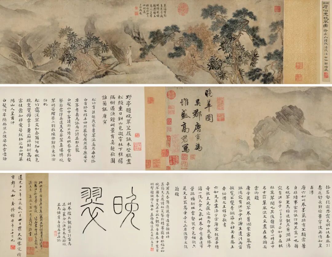 估价:RMB 25,000,000-35,000,0001.吴升著《大观录》卷二十,武进李祖年据三家钞本参订梓行,1920年。2.顾復著《平生壮观》卷十,上海人民美术出版社据道光间蒋氏宋体精钞本影印,1962年。3.乾隆御题诗见“唐寅晚翠图”,《御制诗二集》卷九十。4.潘仕成刊刻《海山仙馆藏真三刻》卷四,1857年。5.福开森著《历代著录画目》,第213页,人民美术出版社,1993年。6.周道振、张月尊辑校《唐寅集》,第366至367页,上海古籍出版社,2013年。7.周道振辑著《唐寅书画资料汇编》,第129页,上海古籍出版社,2017年。2.耿继训、孙承泽、梁清标、乾隆、弘旿、宋葆淳、梁章钜、吴荣光、黄德峻、潘仕成、潘延龄、罗天池、蒋汝藻、宋子文递藏。3.耿继训(清初),清初三藩之一靖南王耿继茂家族成员,康熙初年任松江知府。耿氏一门精鉴赏,富收藏,其子侄辈如耿昭忠、耿嘉祚父子都是清初著名的收藏家。耿继训藏有南宋《洛神赋图》卷、沈周《庐山高图》、戴进《葵石蛱蝶图》等名迹,其收藏的元代曹知白《群峰雪霁图》之后归耿昭忠,再传给耿嘉祚。4.孙承泽(1593-1676),字耳北,一作耳伯,号北海,又号退谷,山东益都人,世隶顺天府上林苑(今河北大兴)。明末清初政治家、收藏家。明崇祯四年(1631)中进士。后投降清朝,历任吏科给事中、大理寺卿、兵部侍郎、吏部右侍郎等职。富收藏,精鉴别书、画。著有《庚子消夏记》《九州山水考》《溯洄集》《研山斋集》等四十余种,多传于世。5.梁清标(1620-1691),字玉立,号棠村,直隶真定人。明崇祯十六年进士,清康熙二十三年(1684)擢保和殿大学士,二十七年(1688)任相国。在清初,他收进了一批名迹,如展子虔《游春图》、顾闳中《韩熙载夜宴图》等,收藏书画有“甲天下”之名。6.何焯(1661-1722),字屺瞻,号义门,江苏长洲人。举试多落第,以受圣祖知,赐进士。选庶吉士,值南书房,至太子侍读兼武英殿纂修。博览群书,长于考订校勘古碑版最精。喜临摹晋唐法帖,所作真、行书并入能品。与姜宸英、汪士鋐、陈奕禧称“四大书家”。7.爱新觉罗·弘旿(1743-1811),清朝宗室、画家。字卓亭,号恕斋,一号醉迂,别号瑶华道人,又号一如居士。清朝康熙帝二十四子允秘的次子。封固山贝子,两次缘事革退,复赏封奉恩将军。能诗,工书、画,以三绝称。家富于藏书,藏书楼名“静寄轩”。8.宋葆淳(1748-1825),字帅初,号芝山,山西安邑人。乾隆五十一年(1786)举人。官隰州学正。长于金石考据,善鉴别,隶书、行、楷,皆入能品。与著名藏书家鲍廷博、厉鹗等人交往颇密。9.梁章钜(1775-1849),字闳中,又字茝林,号茝邻,晚号退庵,福建长乐人。嘉庆七年(1802)进士,曾任江苏布政使、甘肃布政使、广西巡抚、江苏巡抚等职,是坚定的抗英禁烟派人物。也是第一个向朝廷提出以“收香港为首务”的督抚。平生纵览群籍,能诗善书,学识渊博,精鉴赏,富收藏,好金石。10.吴荣光(1773-1843),字伯荣,号荷屋、可庵,广东南海人。嘉庆四年(1799)进士。道光年间升至湖广巡抚兼湖广总督。他在北方和江南广搜名迹,惨淡经营,庋藏书画堪具规模,成为清代中期的鉴藏大家。吴荣光在岭南书法及书画鉴藏史上影响之广泛、流布之深远,可以说前无古人。11.黄德峻(1796-?),字景崧,号琴山。广东高要人。道光二年(1822)进士,官福建泉州府知府署福建粮道。其词选入《粤东词钞》,著有《三十六鸳鸯馆词》。12.潘仕成(1804-1878),字德畲,祖籍福建,世居广东番禺。官至两广盐运使,以盐业起家。仕成承家业,在广州经营盐务并承办海防和军工,遂成当时巨商。经商之余好藏书,筑“海山仙馆”。所藏金石书画多而精,被誉为“南粤之冠”,辑刊有《海山仙馆丛帖》等。13.潘延龄,字健庵,广东番禺人,咸丰时期广东著名收藏大家,搜集历代名迹,蔚为大观。14.罗天池(1805-1856),字六湖。广东新会人。道光六年(1826)官刑部主事,外署云南迤西道,后留职归粤居穗。工书画,精鉴赏。与黎简、谢兰生、张如芝合称“粤东四大家”。15.蒋汝藻(1877-1954),字元采,号孟萍,浙江吴兴人。湖州南浔丝业巨商蒋家之后裔。曾参加辛亥革命,历任浙江军政府盐政局长、浙江铁路公司董事等职。此外,他还曾在北京开设经营古董和字画的来远公司,在上海经营过房地产、航运业等,随着经营的实业不断发达,为他的古籍字画收藏积累了雄厚的资财。其藏书楼“密韵楼”与陆心源皕宋楼、刘承幹嘉业堂、张钧衡适园,被称为吴兴四大藏书楼。16.高时丰(1876-1960),字鱼占,号存道居士。浙江杭州人。为名画家高野侯、高络园之兄,晚清秀才。工书法,四体皆能,楷书得褚遂良、颜真卿法,而篆书亦胜。又擅画山水、花卉,劲厚有韵。兼能治印。17.宋子文(1894-1971),民国时期的政治家、外交家、金融家,海南文昌人,其兄弟姐妹分别是宋庆龄、宋美龄、宋霭龄、宋子良、宋子安。1925年任国民政府财政部长。1942年担任国民政府外交部长后曾与美国国务卿科德尔·赫尔签订中美抵抗侵略互助协定,次年与外国谈判收回各国在华的治外法权。1945年出席联合国大会任中国首席代表。1949年去香港,后移居美国纽约。18.Lot 815-Lot 816为同一藏家委托。