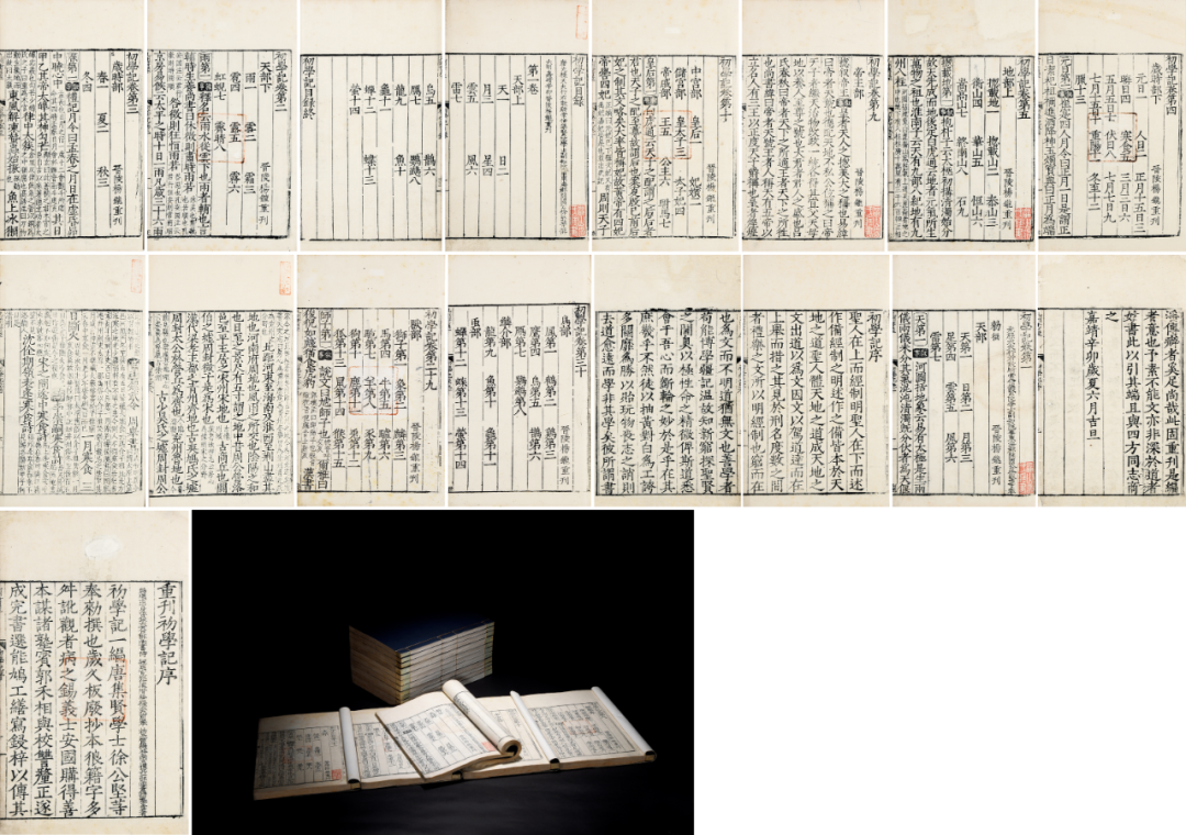 初学记三十卷(九州书屋初印本难得)明嘉靖十年(1531)杨氏九州书屋精刻本(唐)徐堅等奉敕撰 4函16册(附书箱) 白皮纸本28.6×19 cm由拍品题衔及九州书屋可知其为初印本。所用皮纸匀洁坚韧,乃嘉靖间苏州地区上乘皮料,楮墨具佳。刷印精良,字口锐利,墨色浓郁,令人开卷赏心悦目。以内府库纸染作靛蓝书衣,色泽典雅沉稳,与明黄丝线和淡湖绫包角互为映衬,相得益彰。品相极佳,实为不可多得的嘉靖名品。著录:《中国古籍善本总目》、《第一批珍贵古籍名录图录》、《柏克来加州大学东亚图书馆中文古籍善本书志》、《日藏汉籍善本书录》、《日本访书志》、《古文旧书考》"