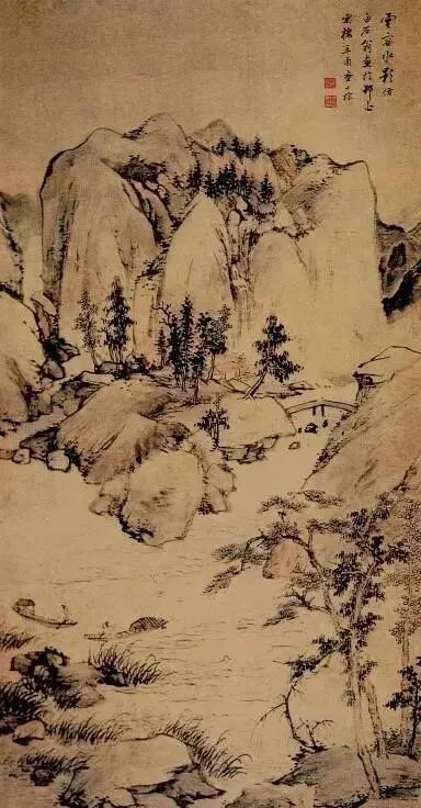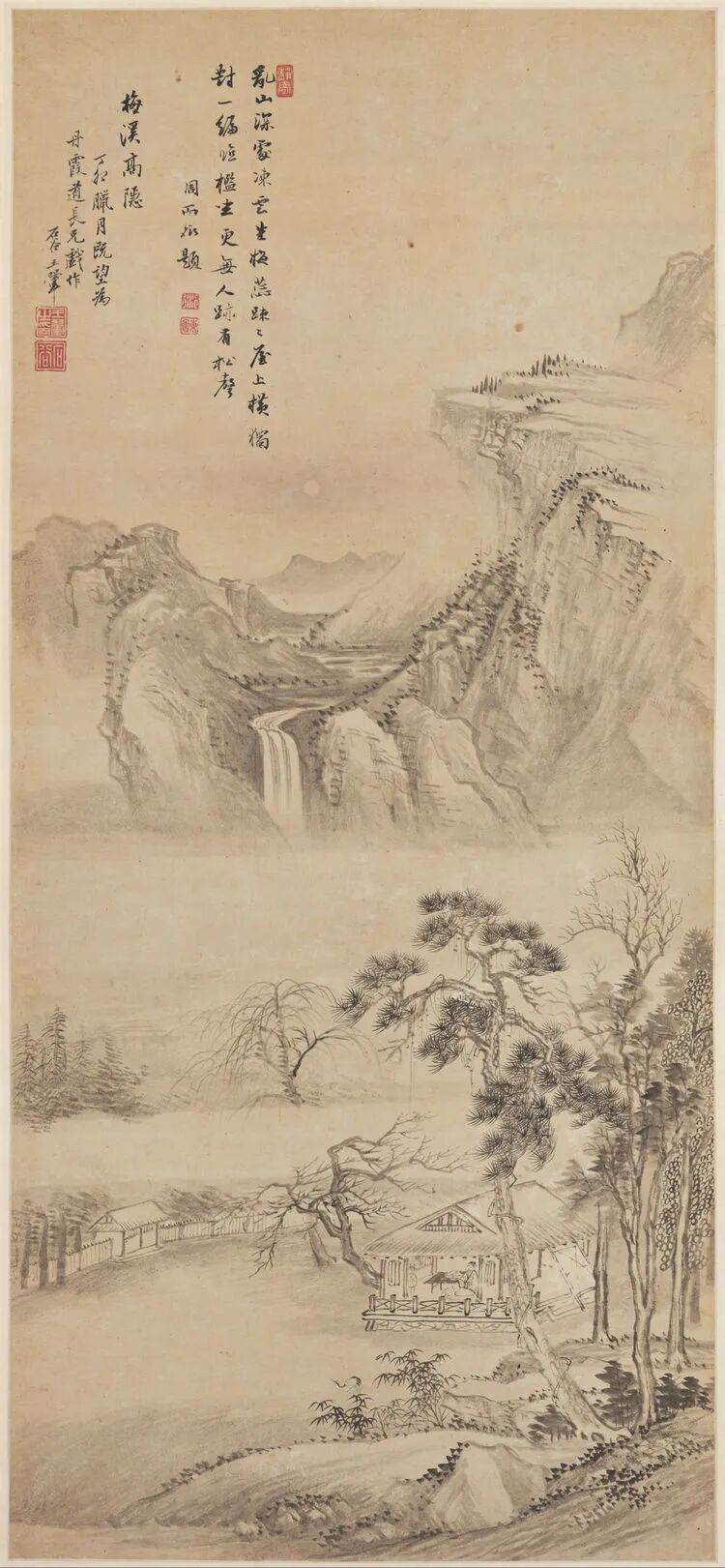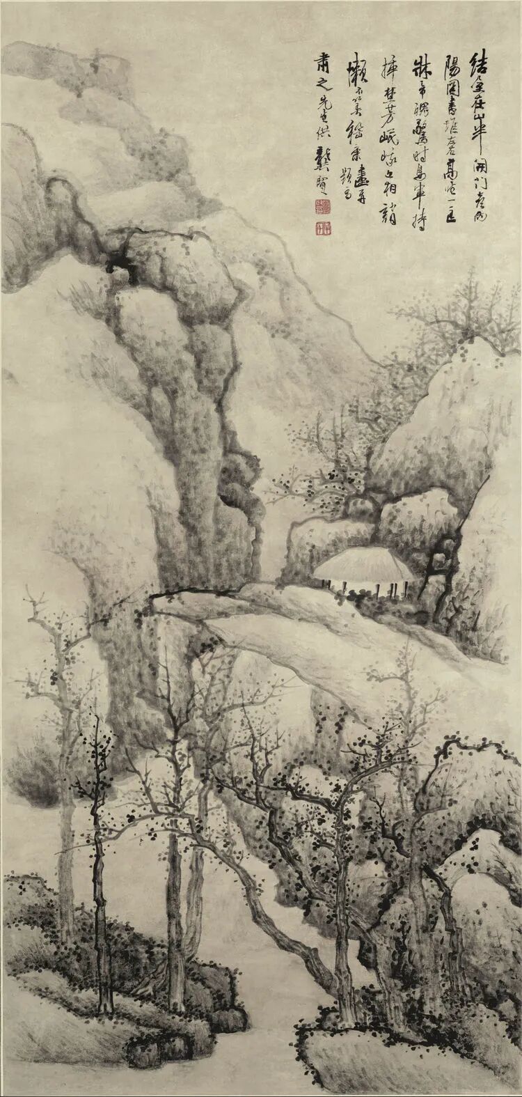 王翚~梅溪高隐图,立轴 纸本 水墨 138x63厘米,此藏:美国弗利尔美术馆,幅绘月夜深山中,冻云下梅香松声,一高士坐茅屋中坐而读书,竹下一鹤伸颈,气氛静谧。石谷子此幅用水墨之静气逸出纸素,用笔则南、北宗兼用,全是自家面目。