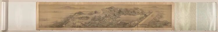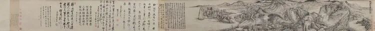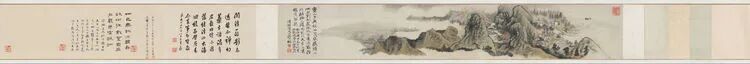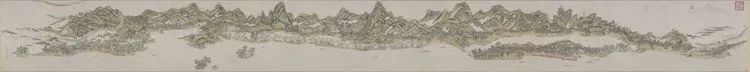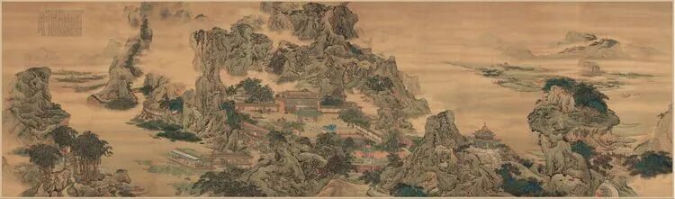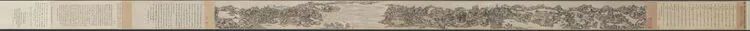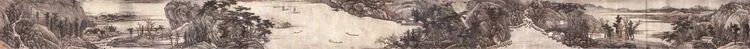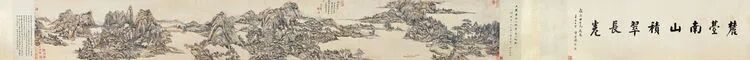 高岺~江山无尽图卷,纸本,水墨,29x453cm,上海博物馆藏。长卷以平铺式绘山水美景,观画似听汩汩泉声,木浆拍水声,朗朗书声,风过松涛声;山脚、岸边树木苍翠,粗壮遒劲;远处云蒸霞蔚,山脉连绵,数座房屋掩映于群山之中,幽雅安静。