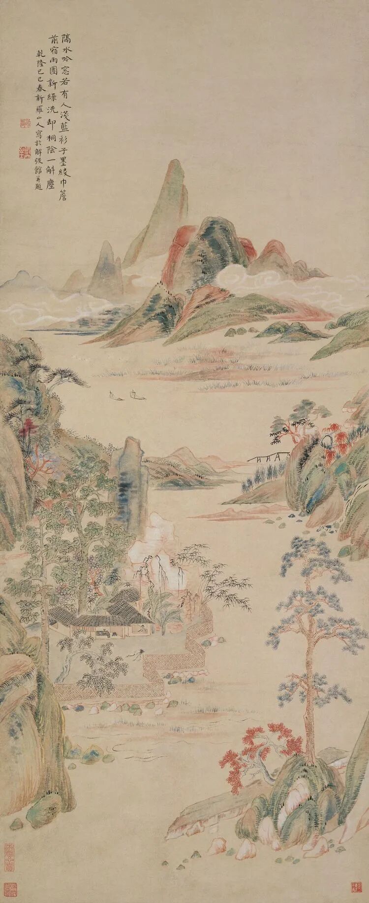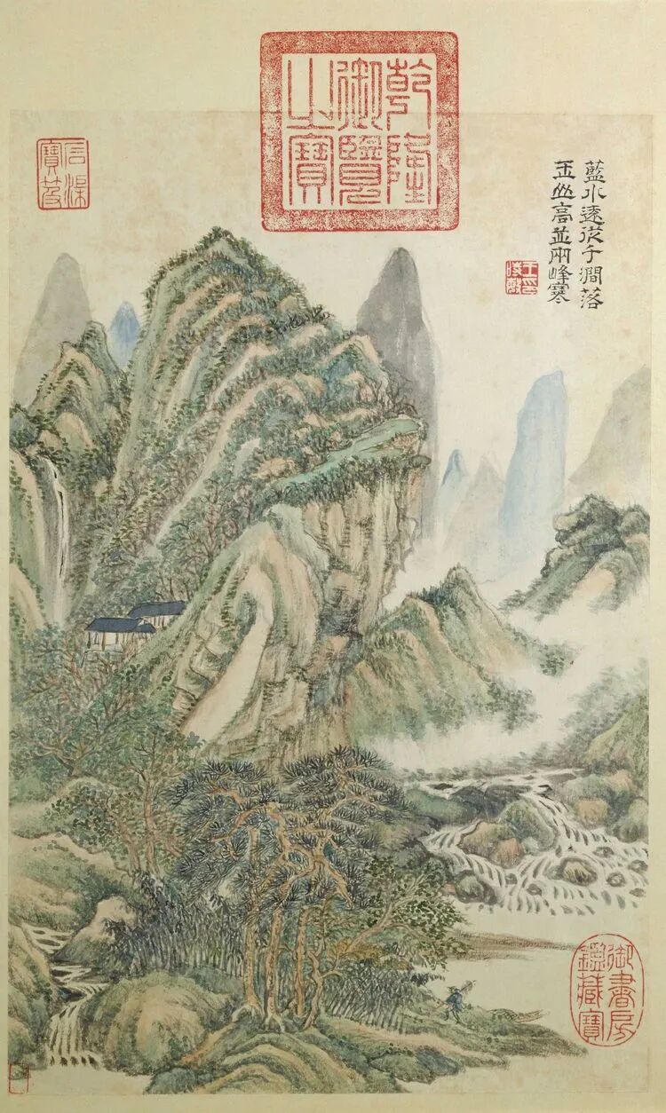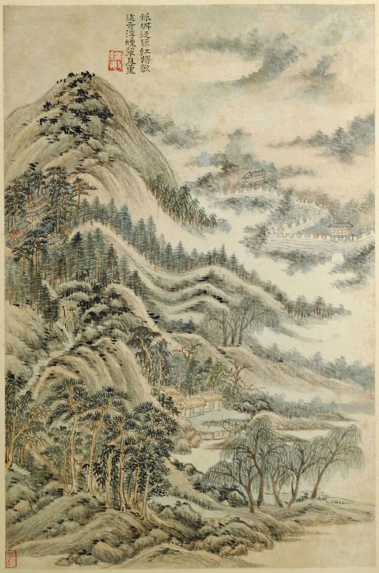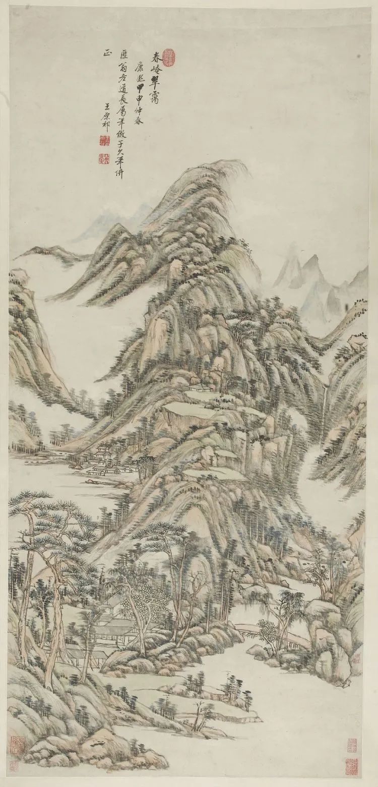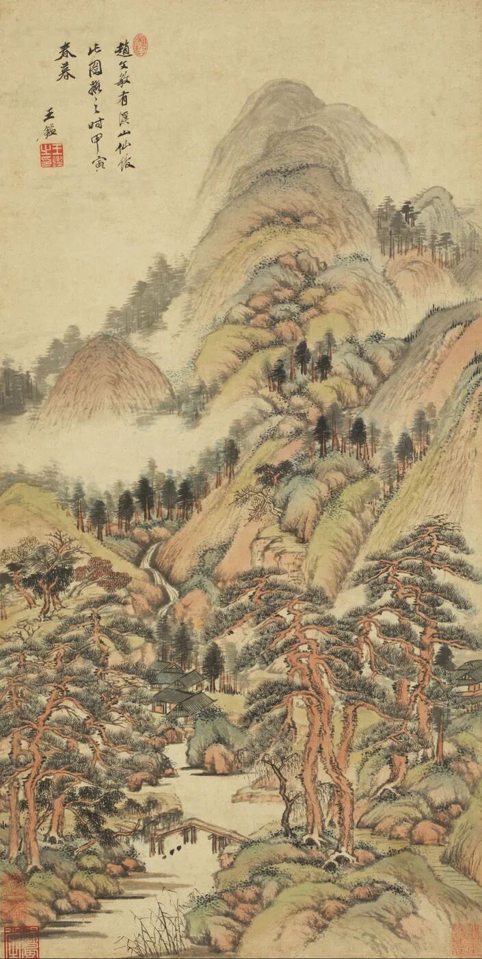 王原祁~春崦翠霭,纸本,设色,133×61.5cm,私人收藏。画自左下的松坡山庄起,经过曲水板桥,连接起画面中央的层峦叠巘,愈上愈远,直至层云迭起的主峰,显出崇高巍伟的景象。题识:春崦翠霭。康熙甲申(1704年)仲春,培翁老道长嘱,仿子久笔并正。王原祁。