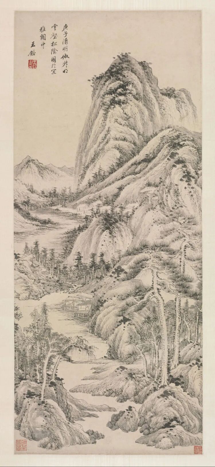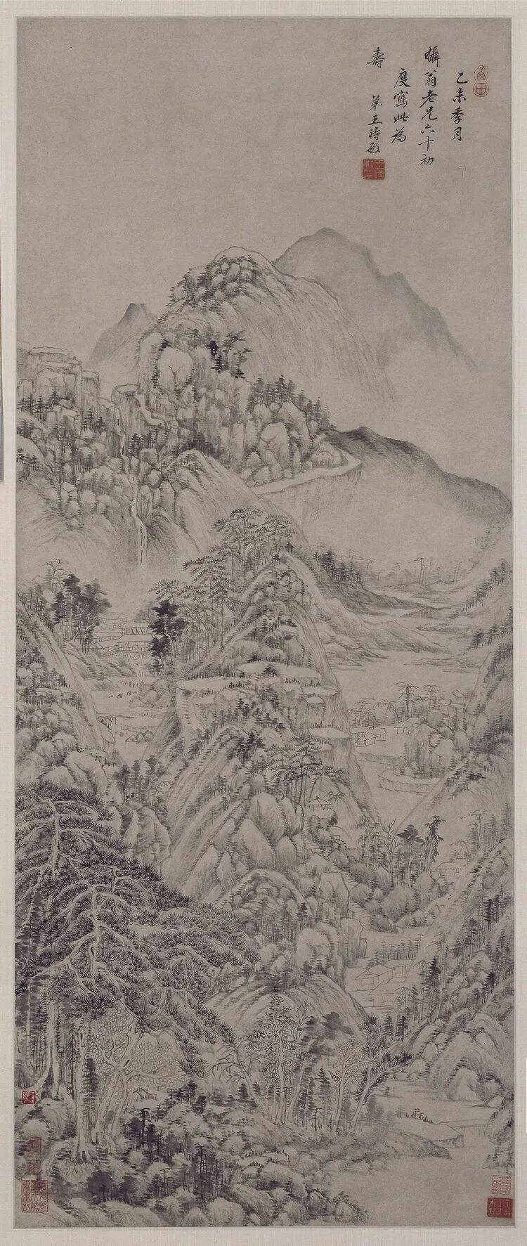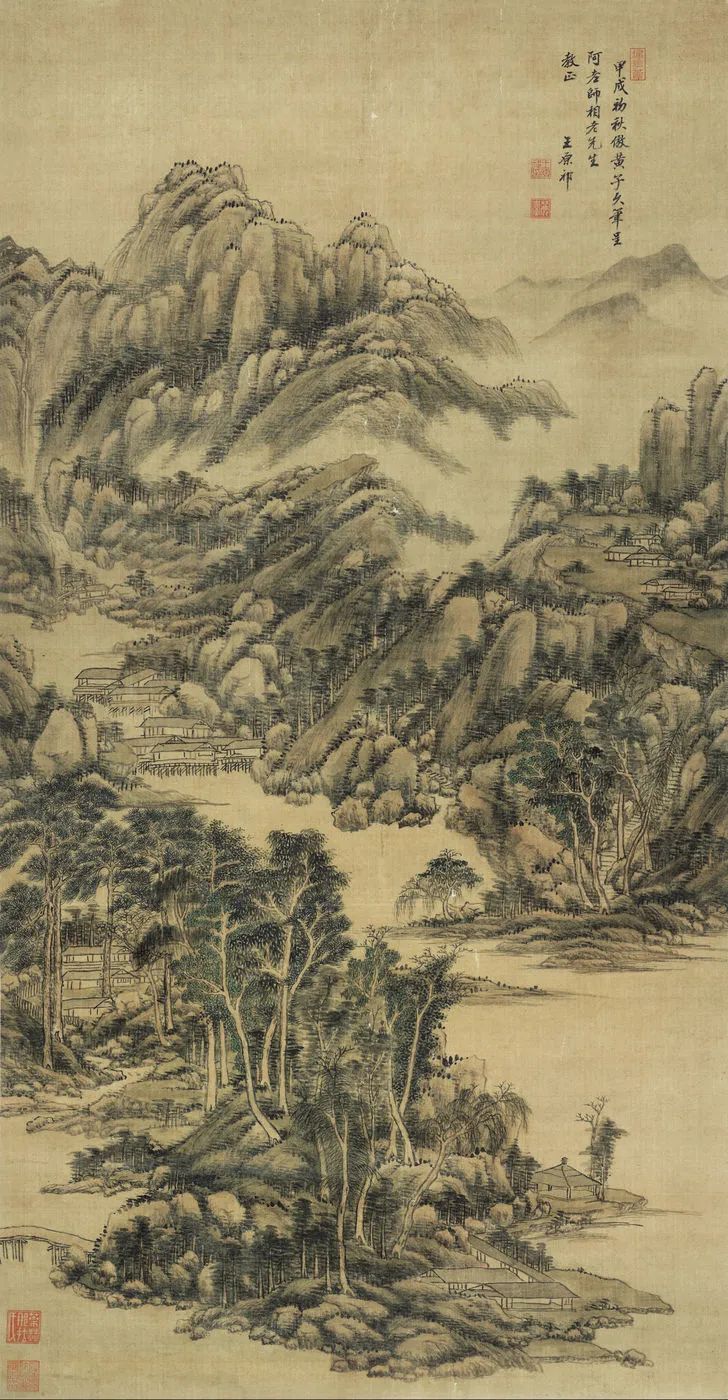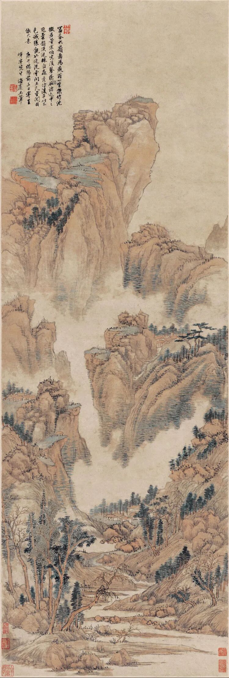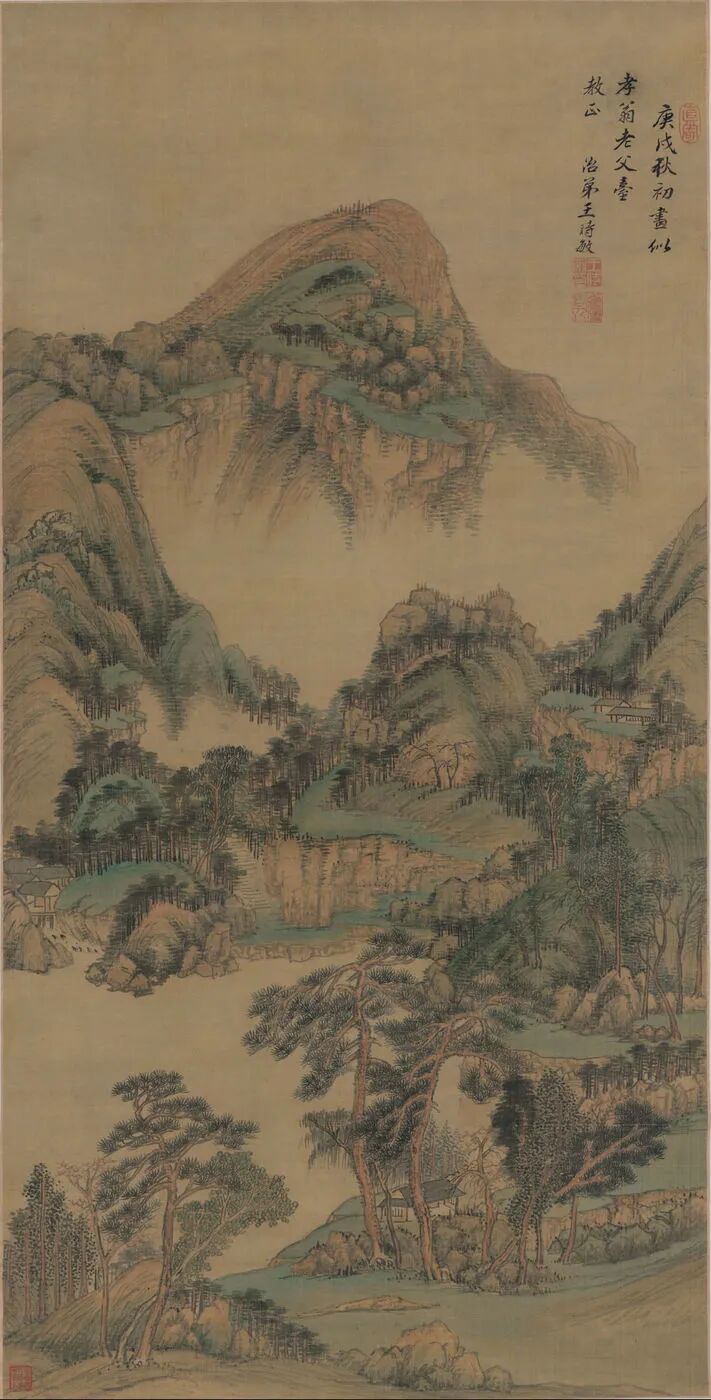 王原祁~春崦翠霭,纸本,设色,133×61.5cm,私人收藏。画自左下的松坡山庄起,经过曲水板桥,连接起画面中央的层峦叠巘,愈上愈远,直至层云迭起的主峰,显出崇高巍伟的景象。题识:春崦翠霭。康熙甲申(1704年)仲春,培翁老道长嘱,仿子久笔并正。王原祁。