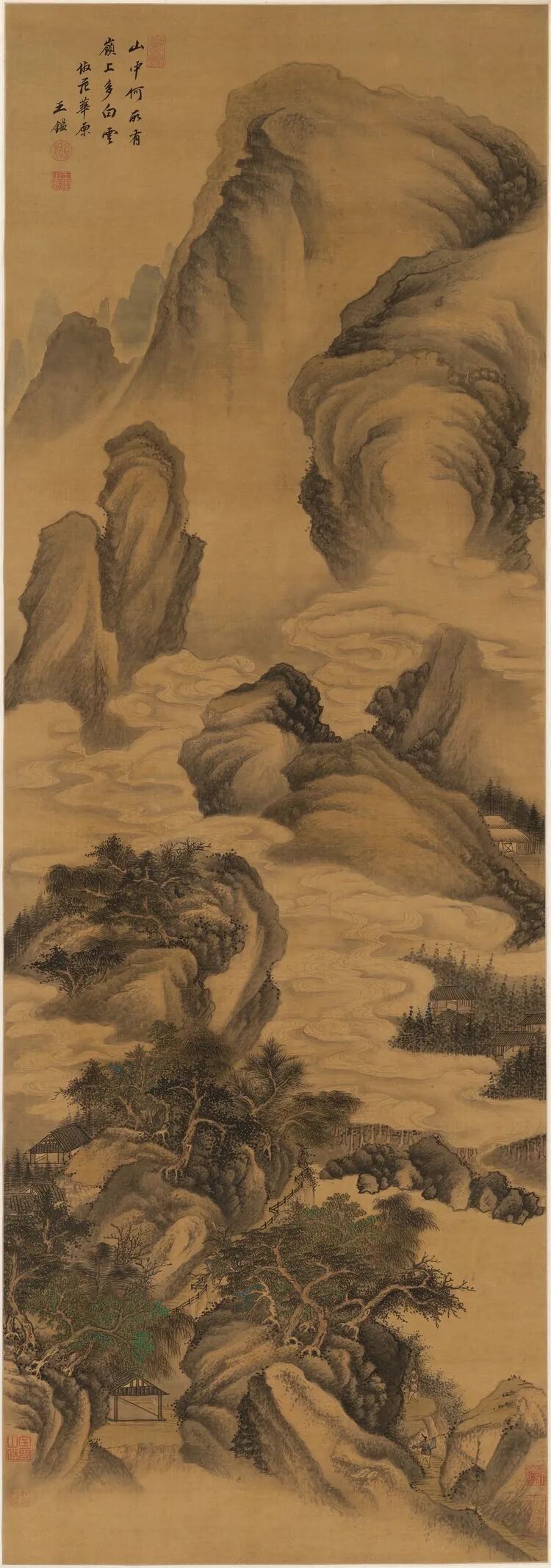 王鉴~岭上白云图,绢本,设色,143.7x50.6cm,故宫博物院藏。绘山峦叠嶂,山峰连绵,白云在山中萦绕;山腰处松柏苍翠,长势繁茂,风过松涛阵阵,平坦处建造数座楼阁亭台,在此小憩赏景,实乃快哉!画上画家自题:“山中何所有,岭上多白云。