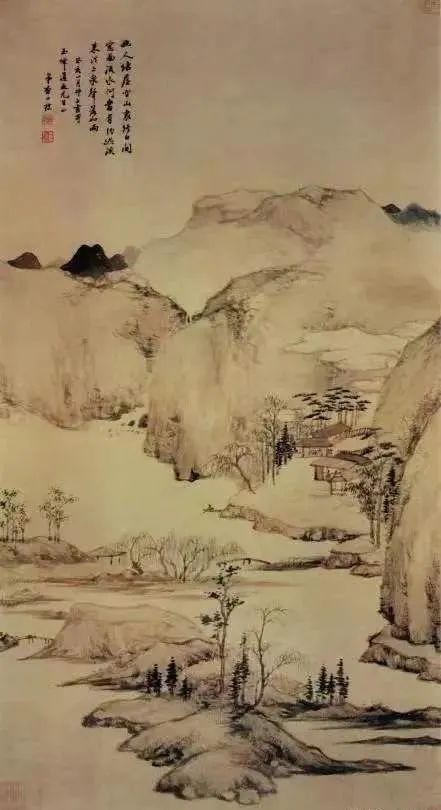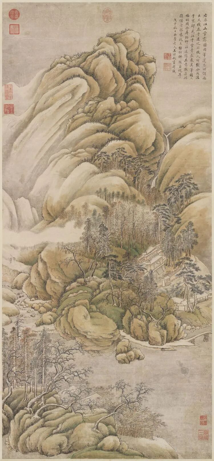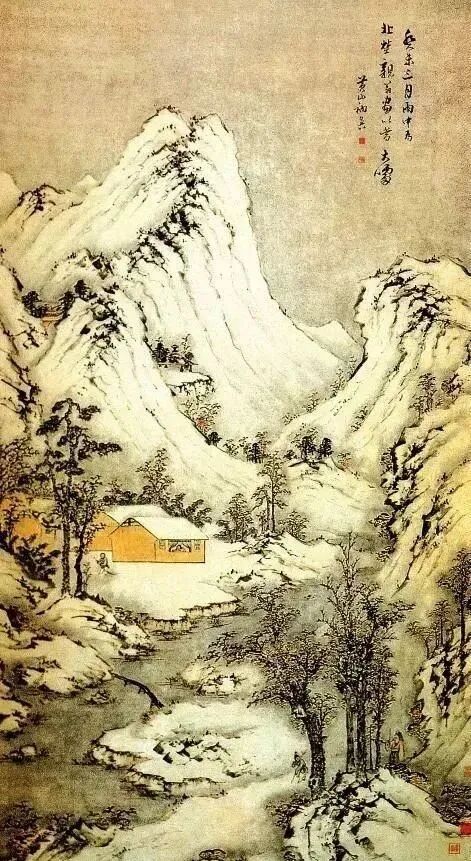 王时敏仿王维江山雪霁轴,纸本,淡设色,133.7*60cm,台北故宫博物院藏。绘峰峦层叠,瀑布由山腰奔腾而下,隐入林中,山腰处房舍寺院;白雪覆山,小径曲折通向远处,农夫相间往来,石岩之前溪流潺缓,呈现出清静、纯洁、寒意袭人的意境。