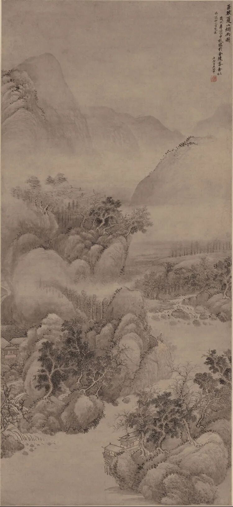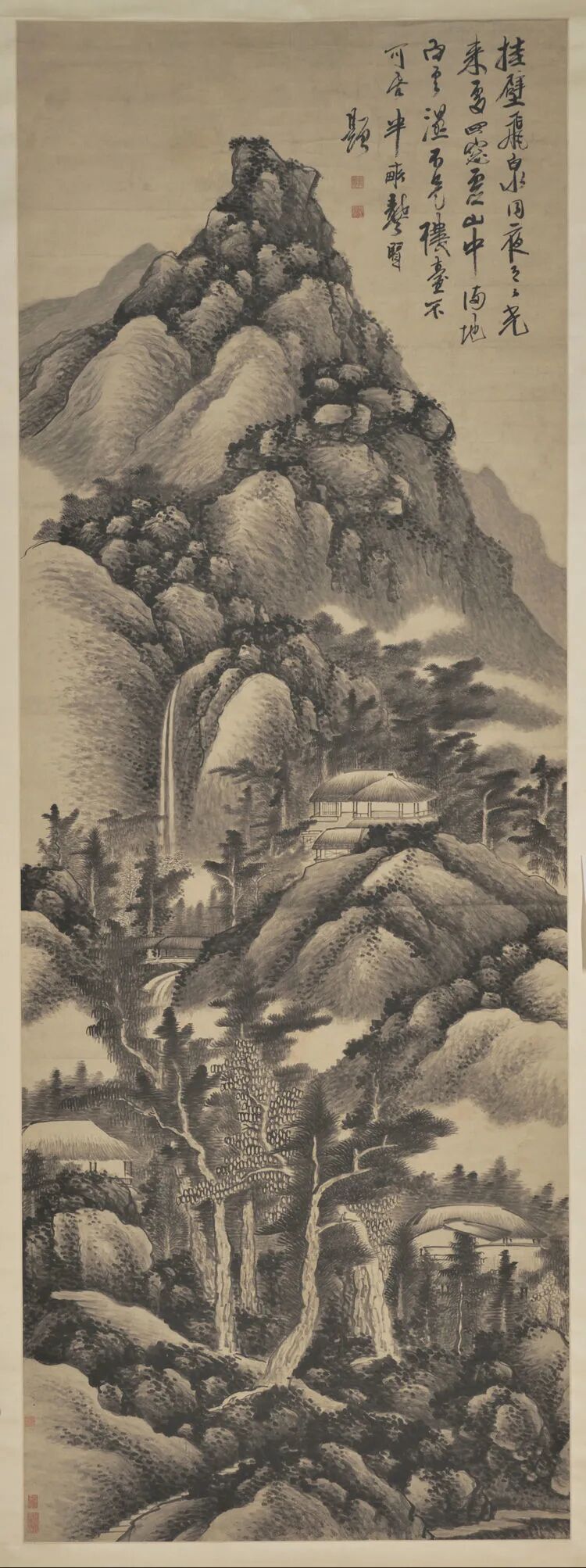 龚贤~挂壁飞泉图轴,纸本,水墨,124x46cm,天津博物馆藏。绘群山环抱,山峰巍峨,山石圆润厚重,山中树木成林,山腰处一道飞瀑倾泻而下,气势雄伟磅礴,有“飞流直下三千尺”之壮观;数座亭台楼阁隐现,在此观景听瀑,实乃世外桃园般的生活享受。