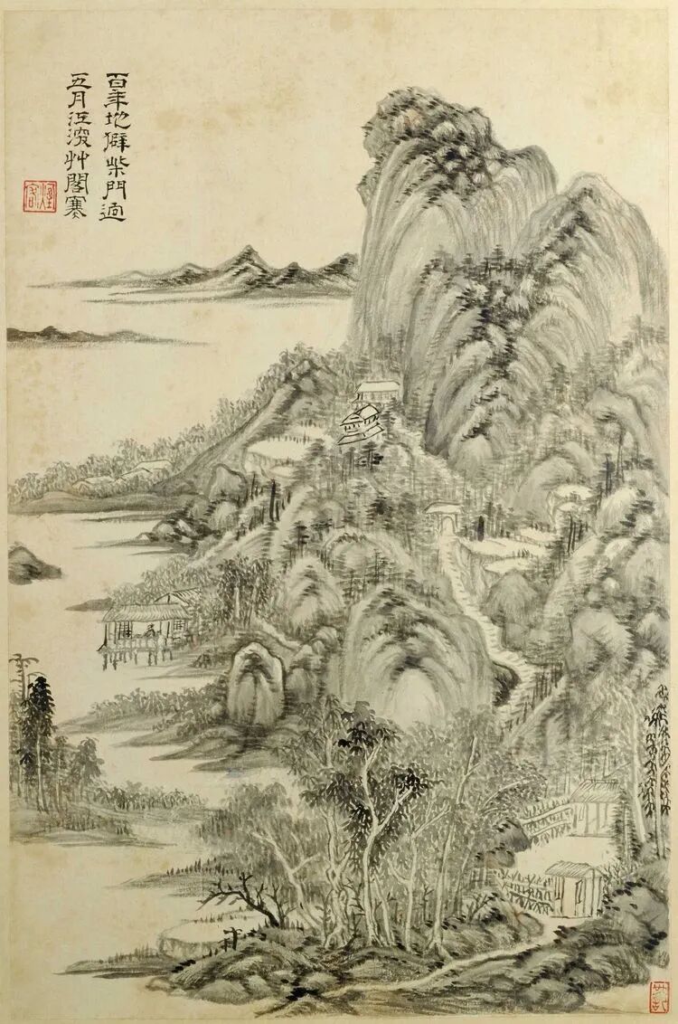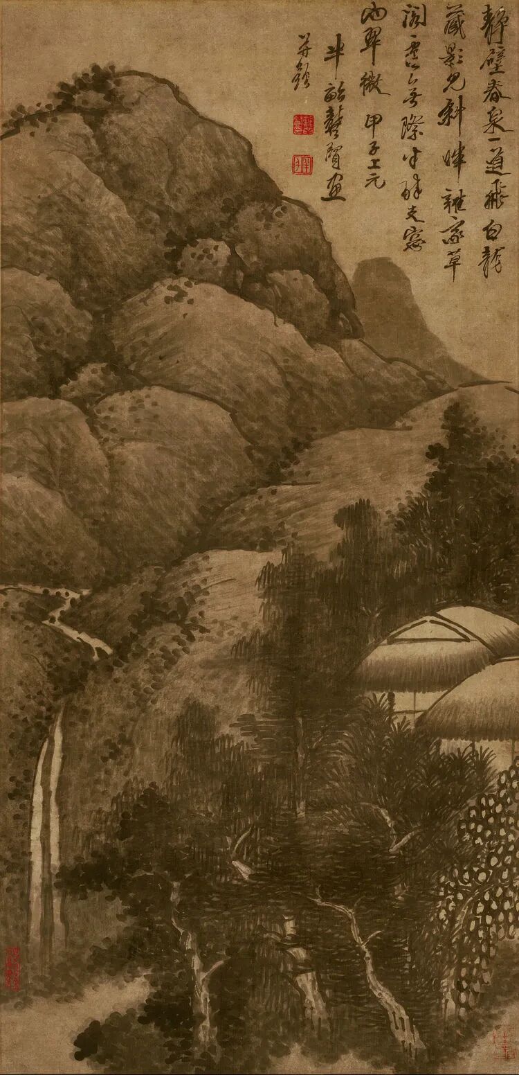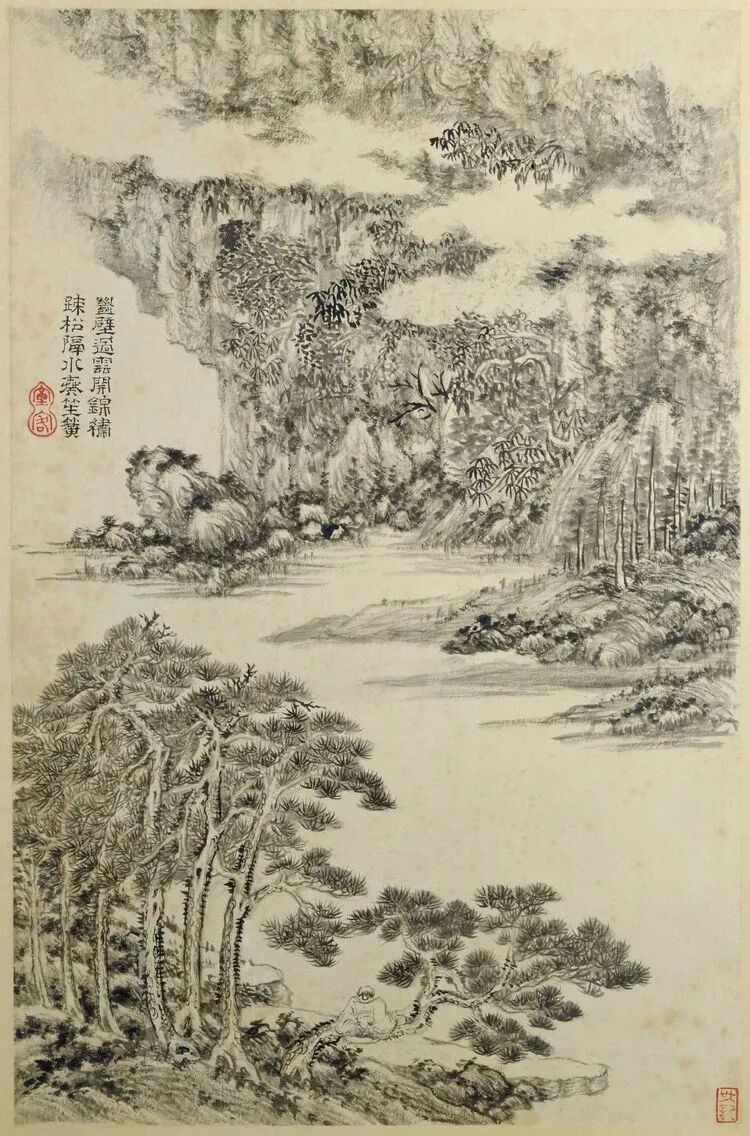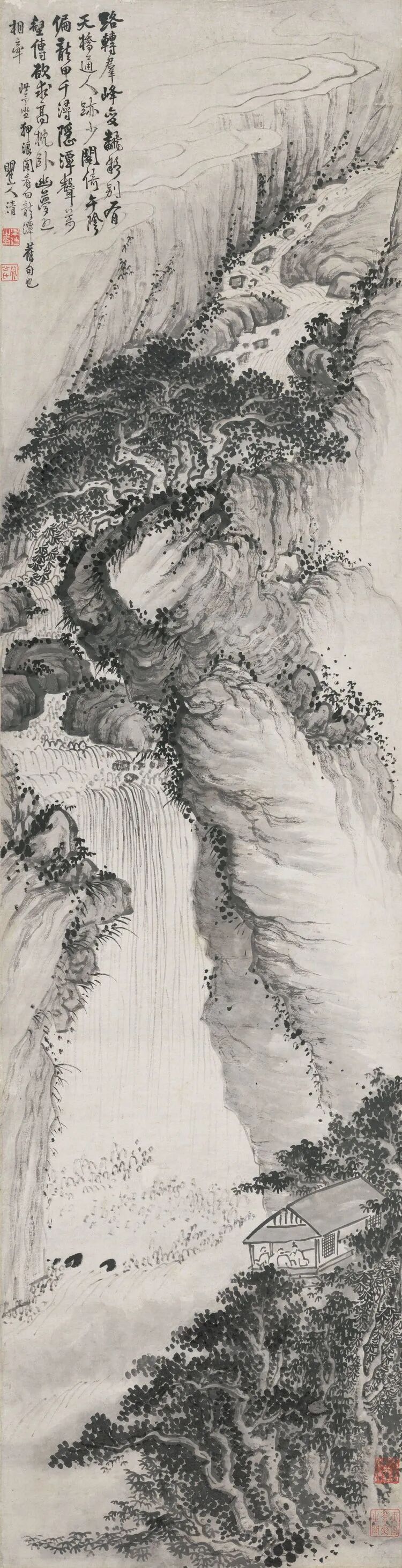 龚贤~一道飞泉,纸本,水墨,79*38.2cm,辽宁省博物馆藏。绘山肪连绵,群山中一条瀑布蜿蜒向前,汇合山中后倾泻而下,如一道白练直下潭底;山中树木苍翠,画右侧二座茅屋隐现。画上有画家自题诗一首:静壁春泉一道飞,白龙藏影见斜晖。醉醒醒惊开竹户,擎甆尽日看湖光。