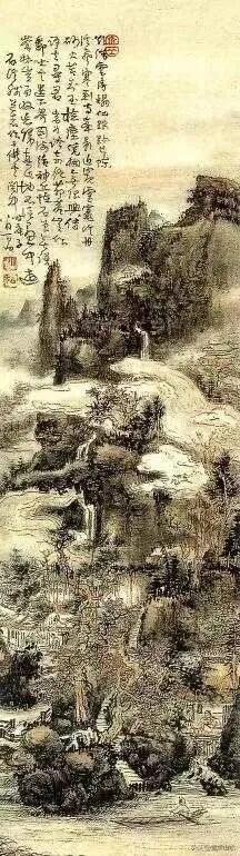 石涛~搜尽奇峰打草稿,纸本,水墨,42.8x285.5cm,故宫博物院藏。长卷绘山峦起伏环抱,尖峰峭壁直插,奇峦怪石或横或耸、错落其间,山中溪流萦回,曲曲折折注入大江,卷尾一山屹立江心,烟浮远岫,思出画外。其间并点缀有苍松茂树,舟桥屋宇。卷首画家自题:搜尽奇峰打草稿。
