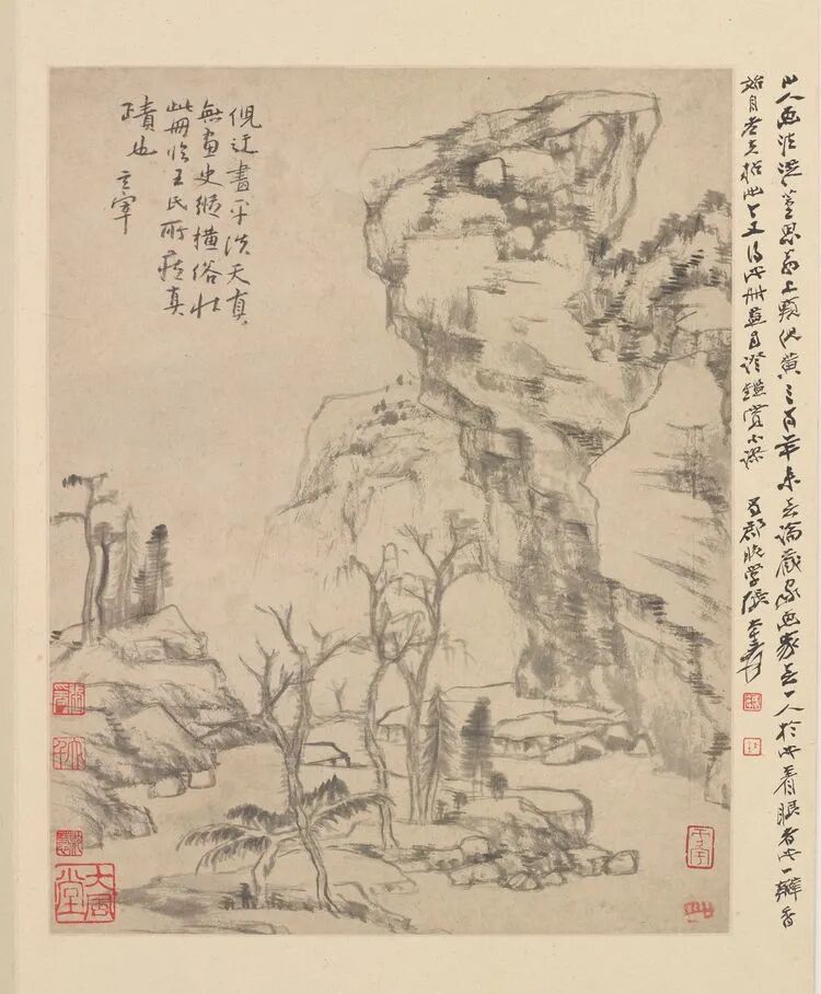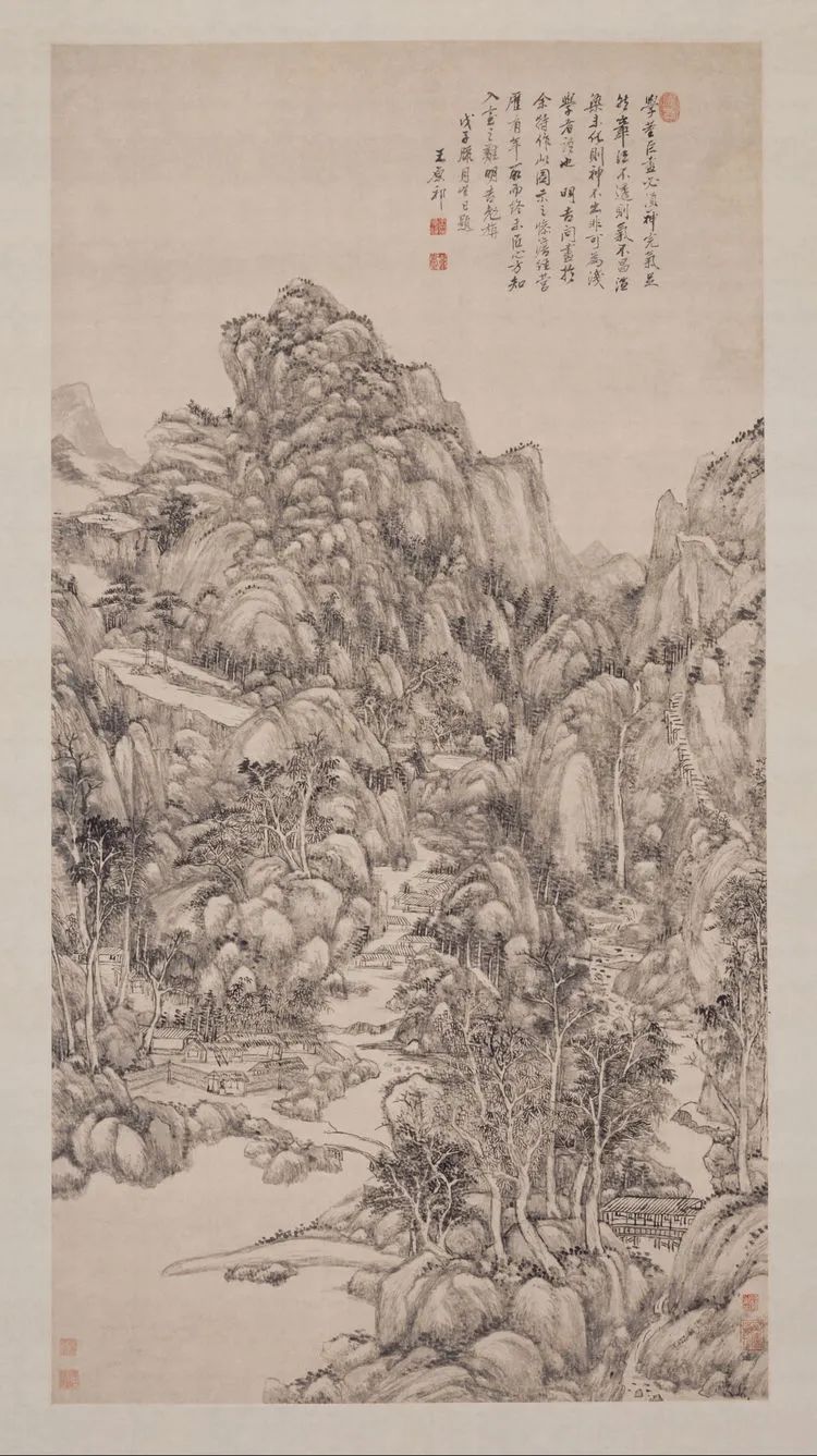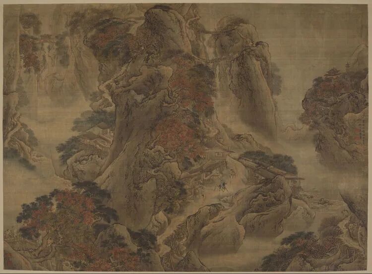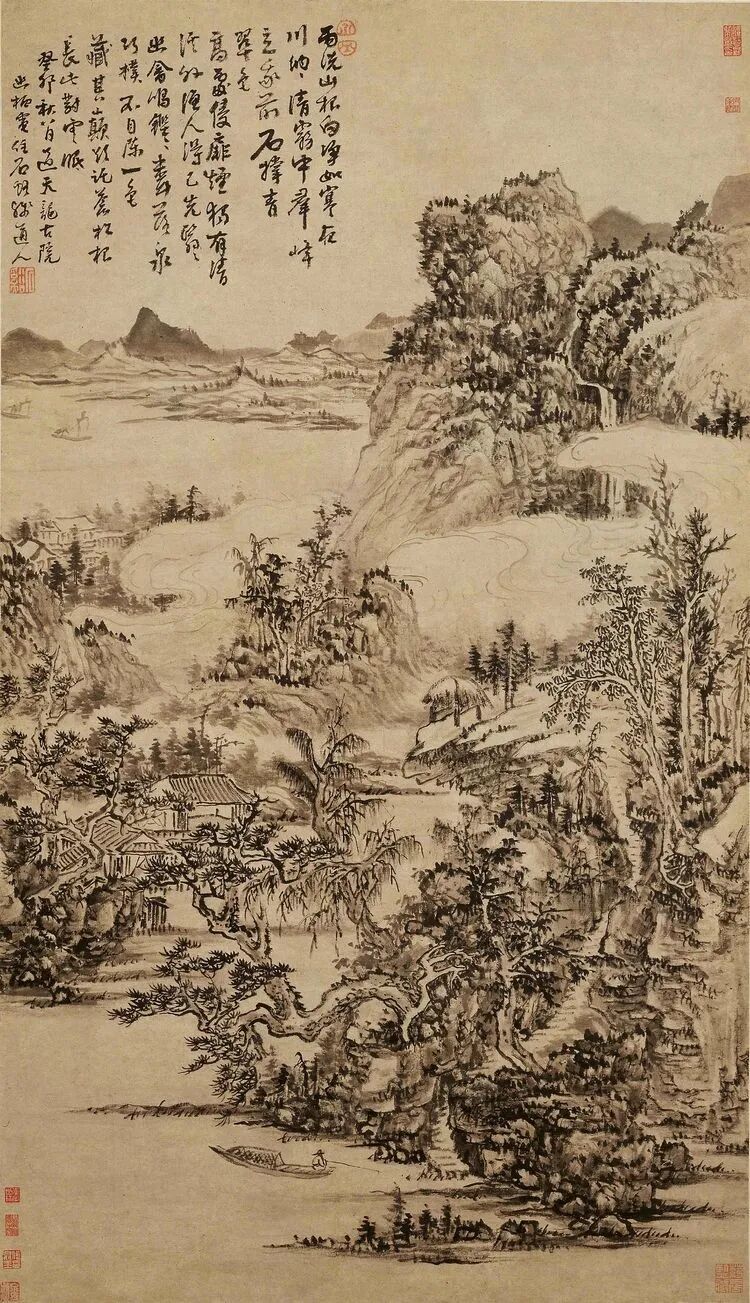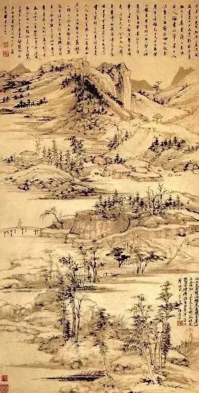 此图构图繁复,丘壑多变,内容丰富,引人入胜,是作者的传世之作。此图运用了苍秀醇厚的笔法, 干笔皴擦,焦墨蓬松的点苔以及披麻、解索等皴法。